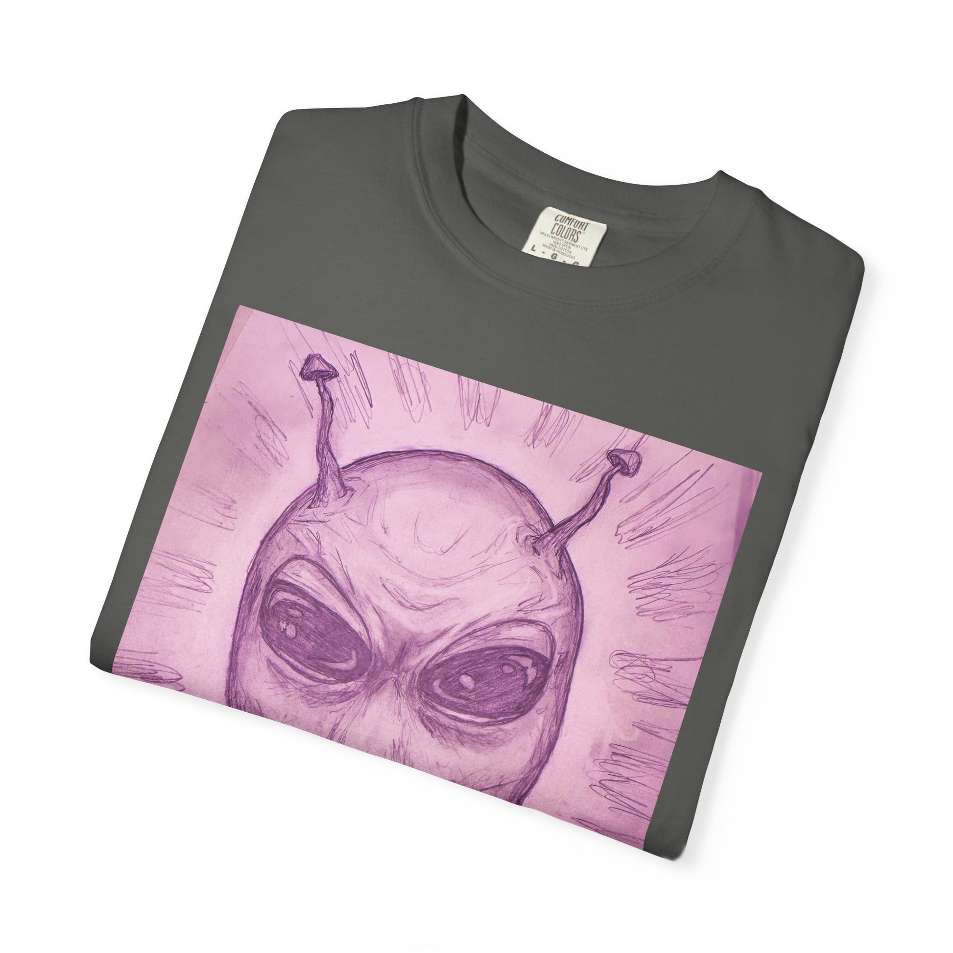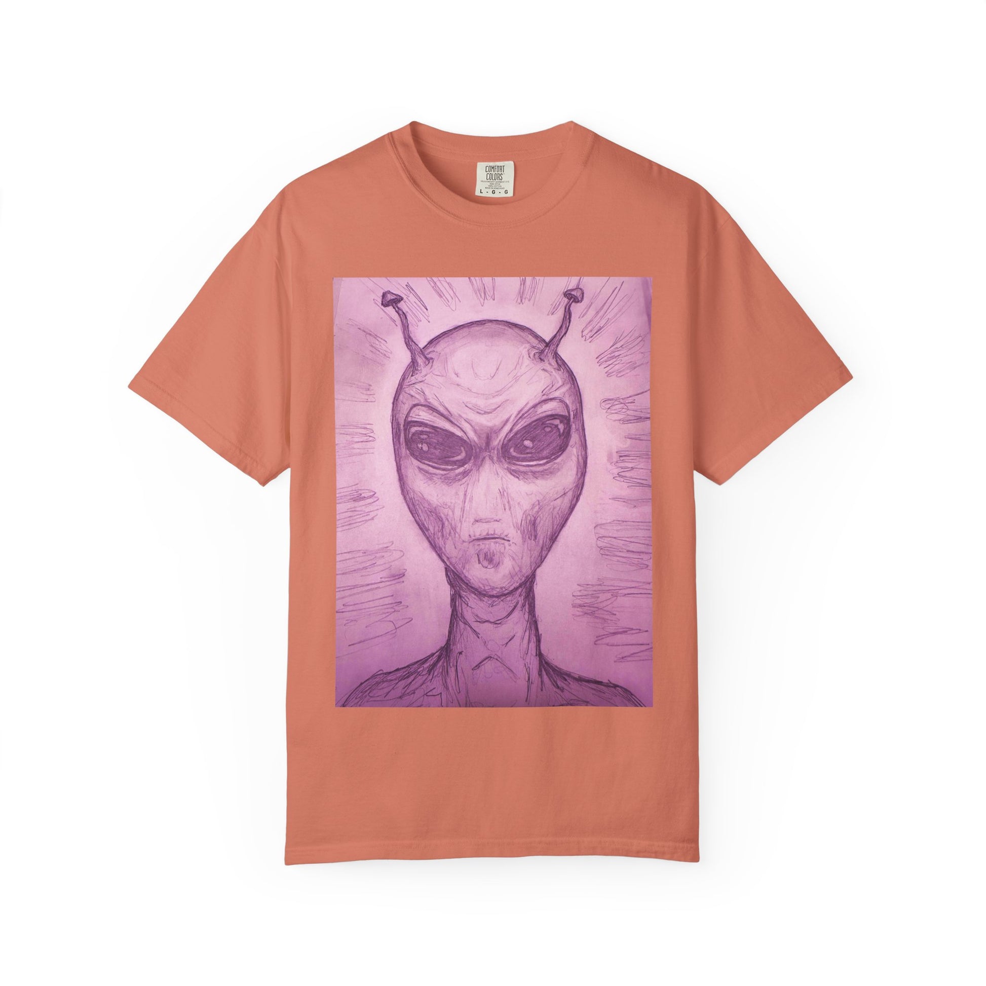 This alien design T-shirt in a pink mist background gives off a unique and mystical vibe. It is perfect for fans of sci-fi and fantasy genres, and makes a great statement piece for casual wear. Ideal for those who love outer space themes and want to stand out. Perfect for gifting during Halloween, Comic-Con, and UFO events.