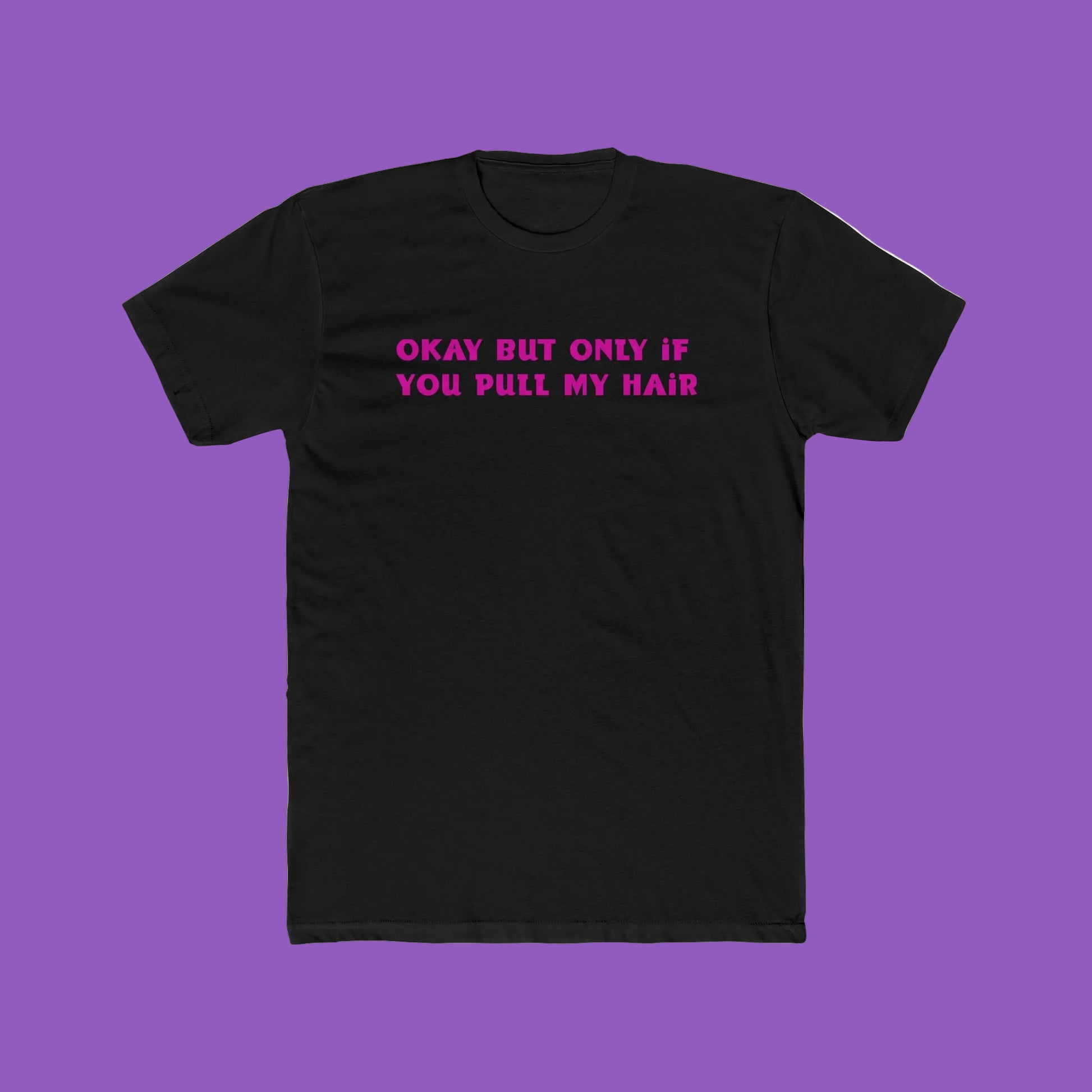 Crew Tee - "Okay But Only If You Pull My Hair" Pink Text Graphic Tee