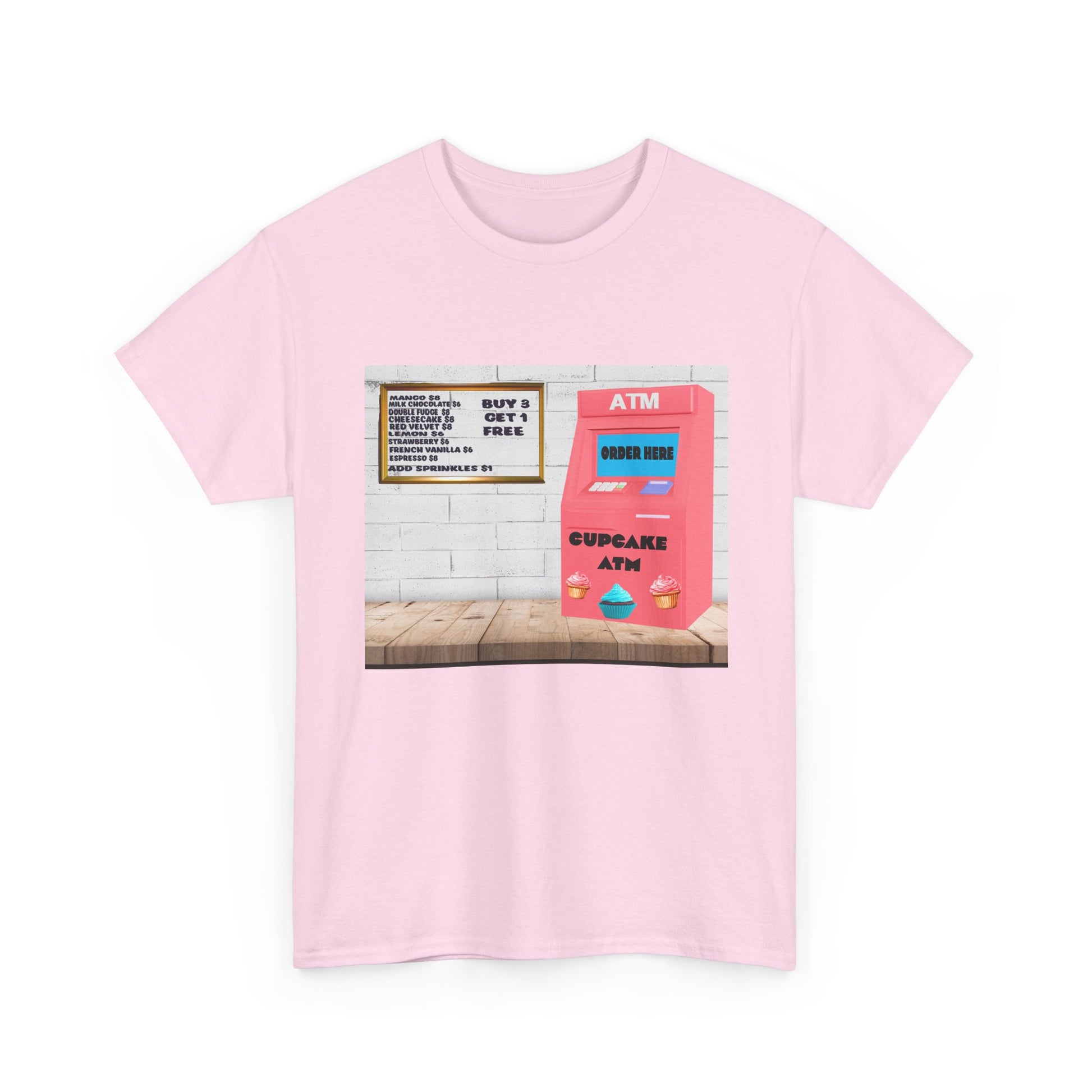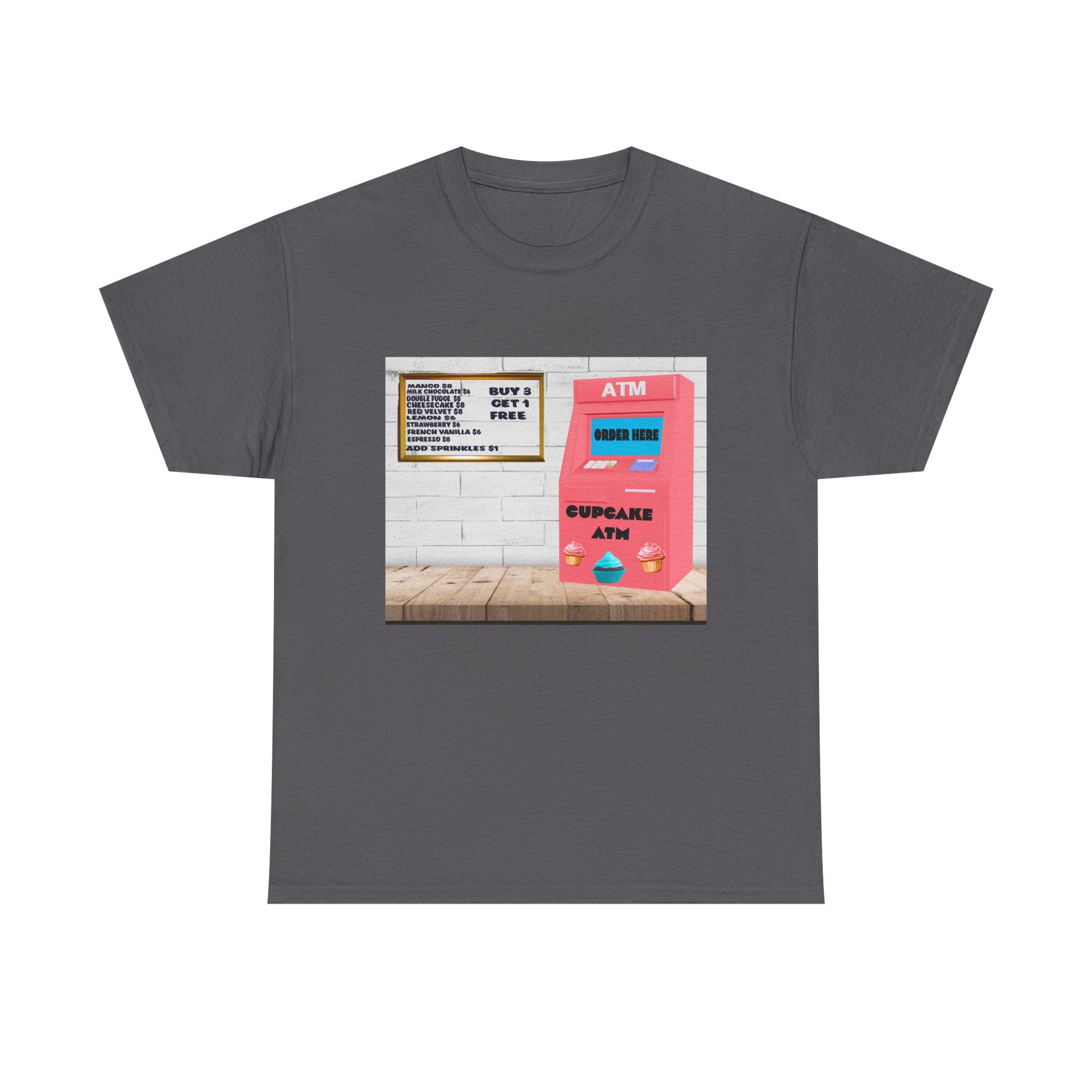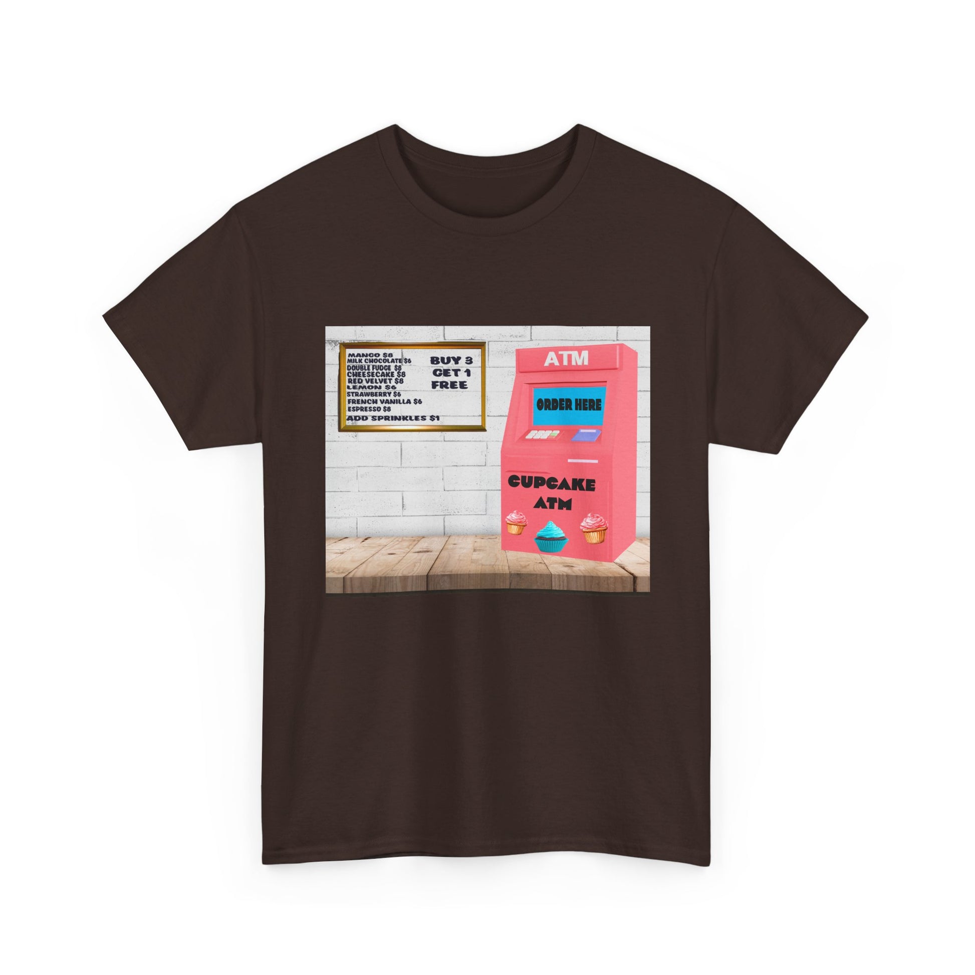 This Cupcake ATM design T-Shirt features prices, giving off a fun and whimsical vibe. Perfect for those with a sweet tooth or anyone looking to add a playful touch to their wardrobe. Ideal for birthdays, holidays, or casual everyday wear.