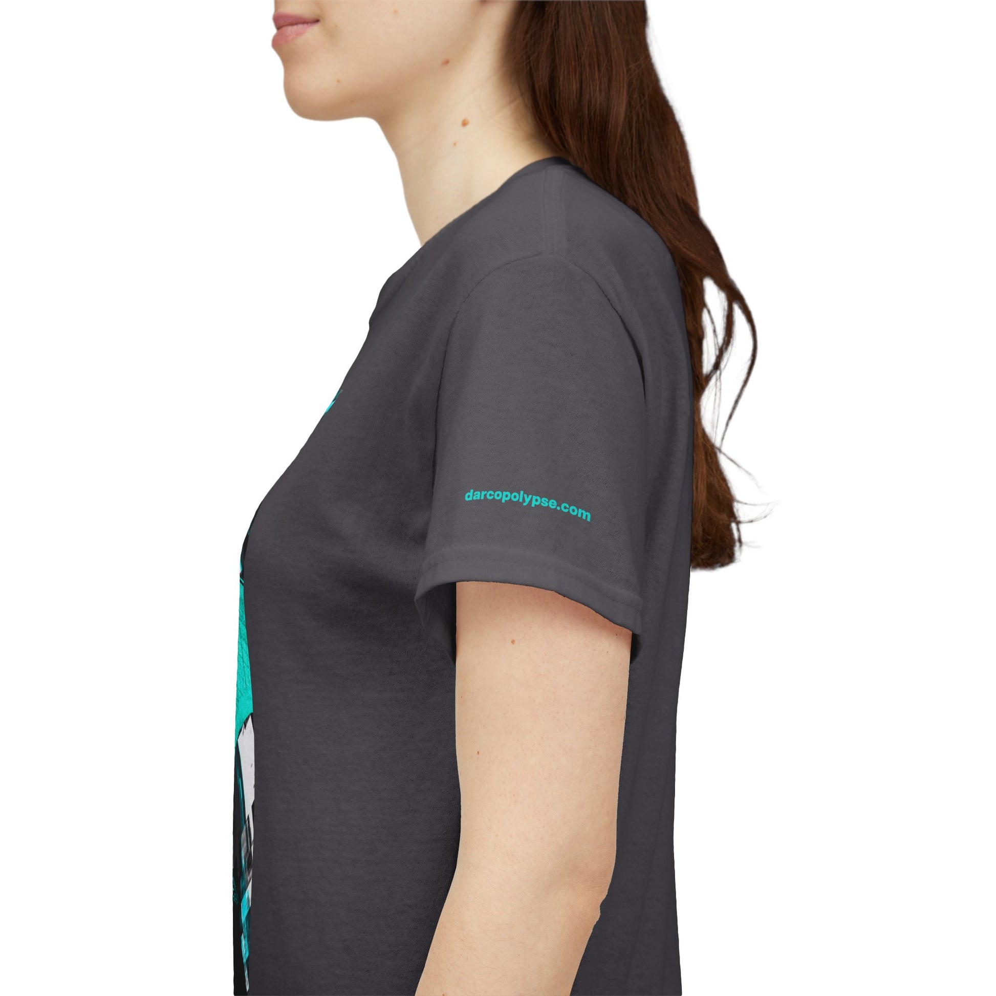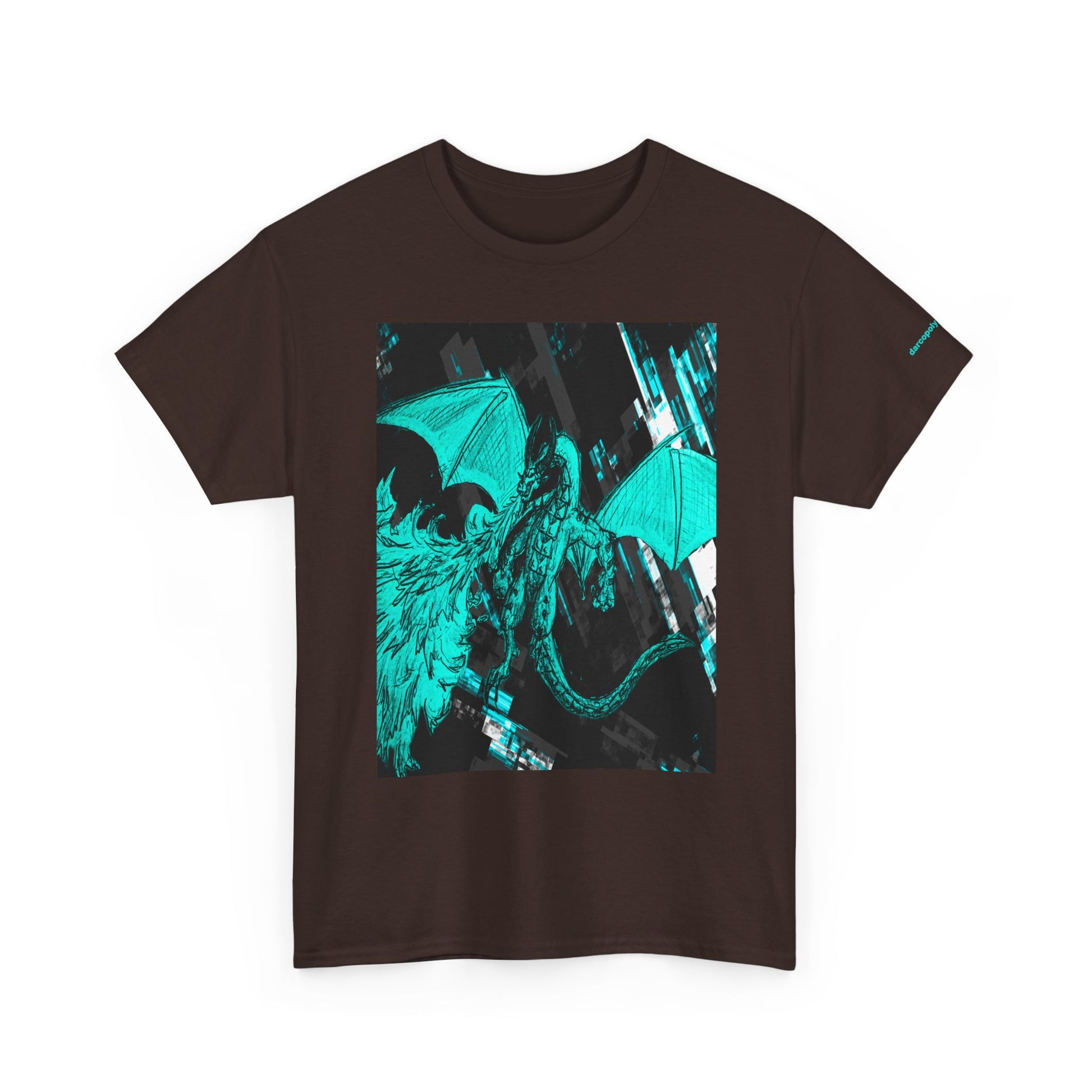 This tee carries a moody, mythic energy — a teal-toned dragon image printed on a crisp white classic-fit shirt. The artwork feels like a midnight alley transformed: scaly wings spread across a square print, high-contrast shadows and vivid cyan highlights that pop against the cotton. Wear it when you want to bring an urban-fantasy vibe to everyday outfits. It layers cleanly under jackets, pairs with worn denim or cargo, and anchors a look for nights out with friends or low-key creative meetups. The shirt’s relaxed silhouette keeps the focus on the image while staying comfortable for long days and late nights.