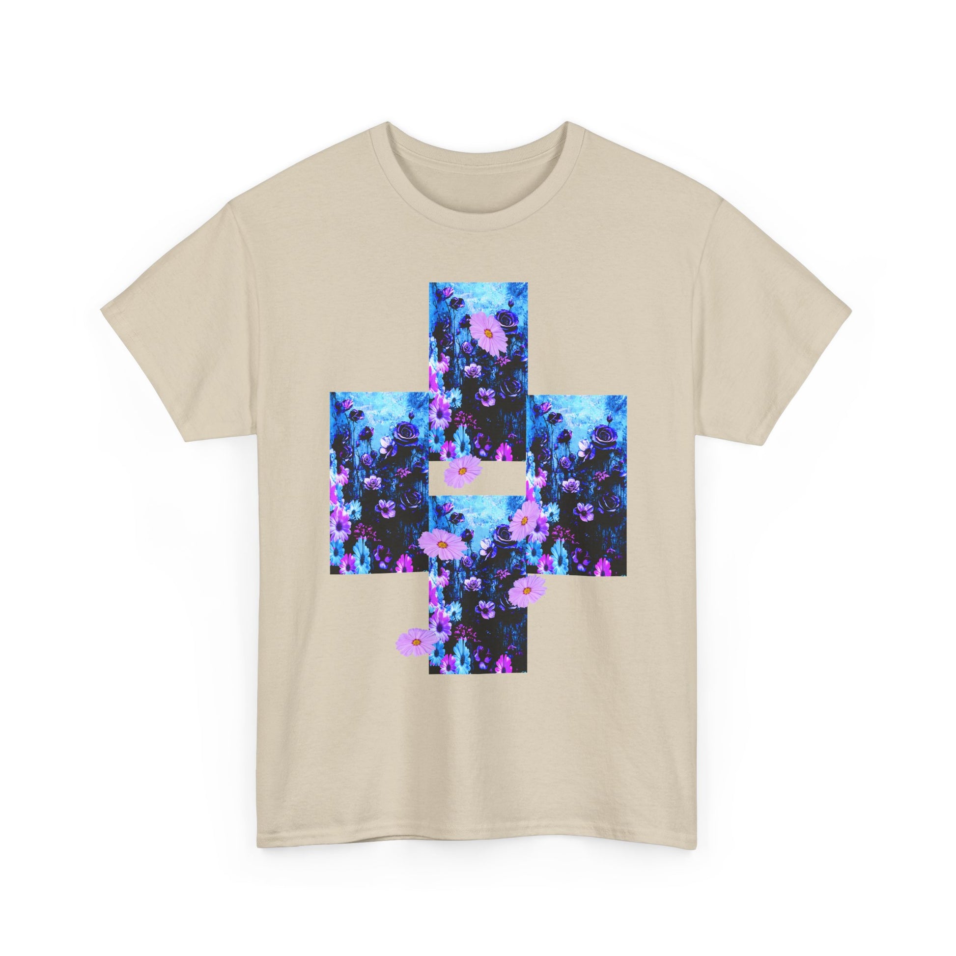 This relaxed crewneck tee carries a quiet, modern edge — a soft white canvas punctuated by a bold floral cross in electric blues and magenta. It feels like a stolen moment on a late-night walk: neon blooms glowing under streetlamps, calm and a little rebellious. The classic cut sits comfortably on the shoulders, the ribbed collar keeps its shape wash after wash, and the tubular knit gives a clean, seamless silhouette that layers easily. Wear it to shows, city strolls, or low-key meetups when you want an understated statement that still reads intentional and artful.