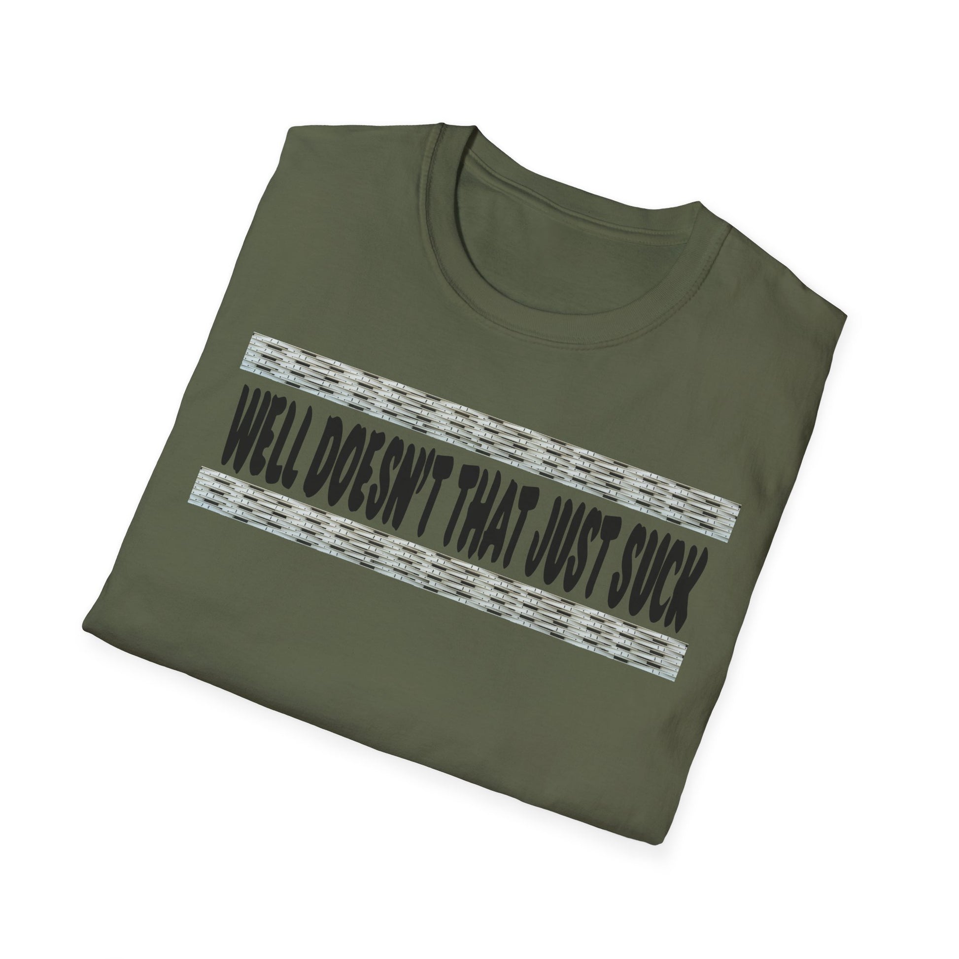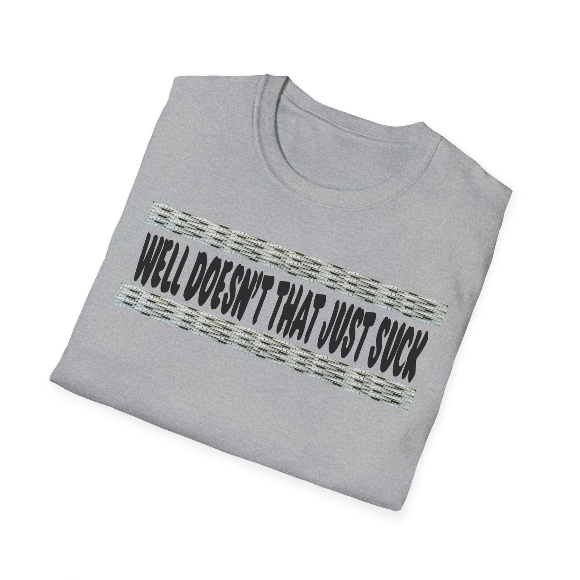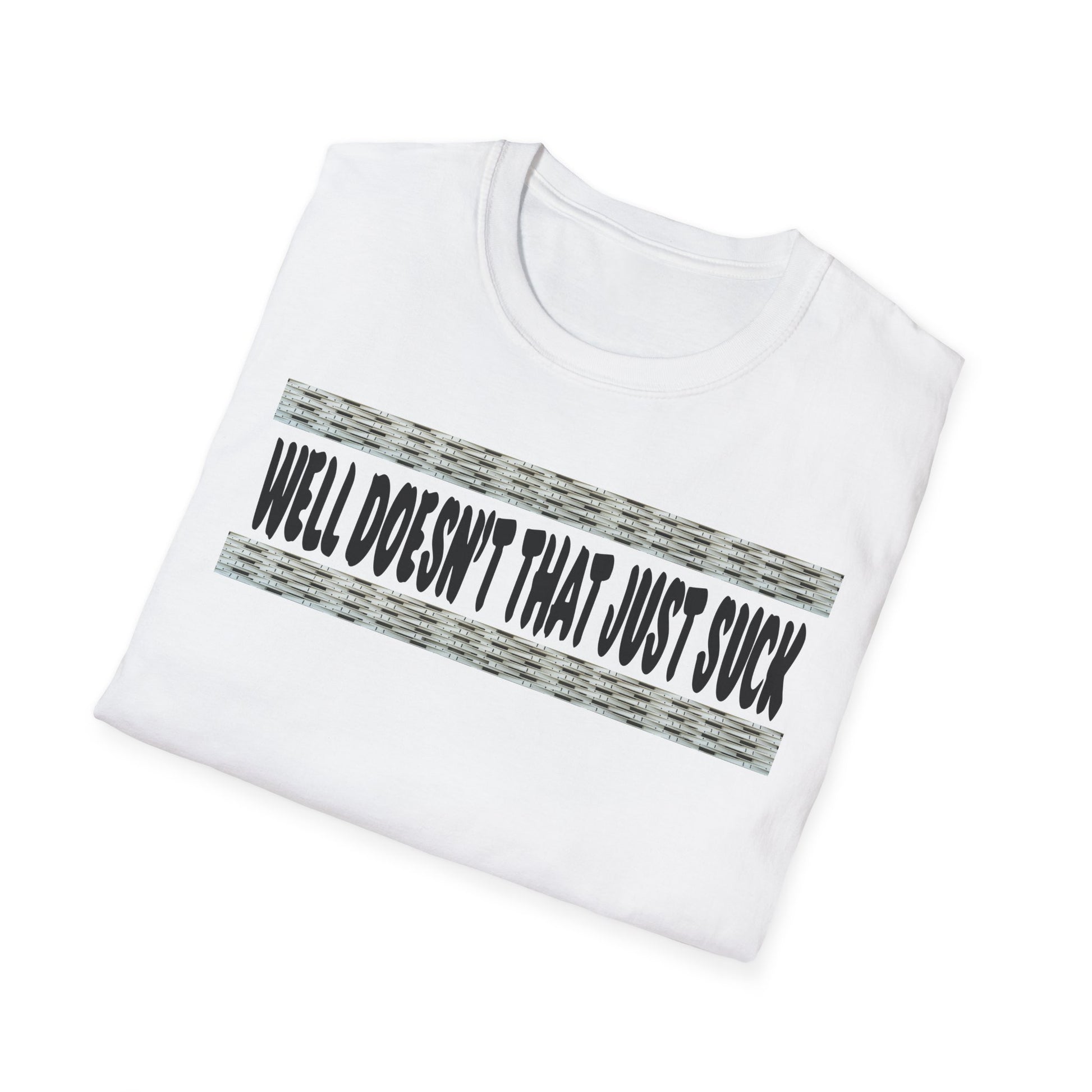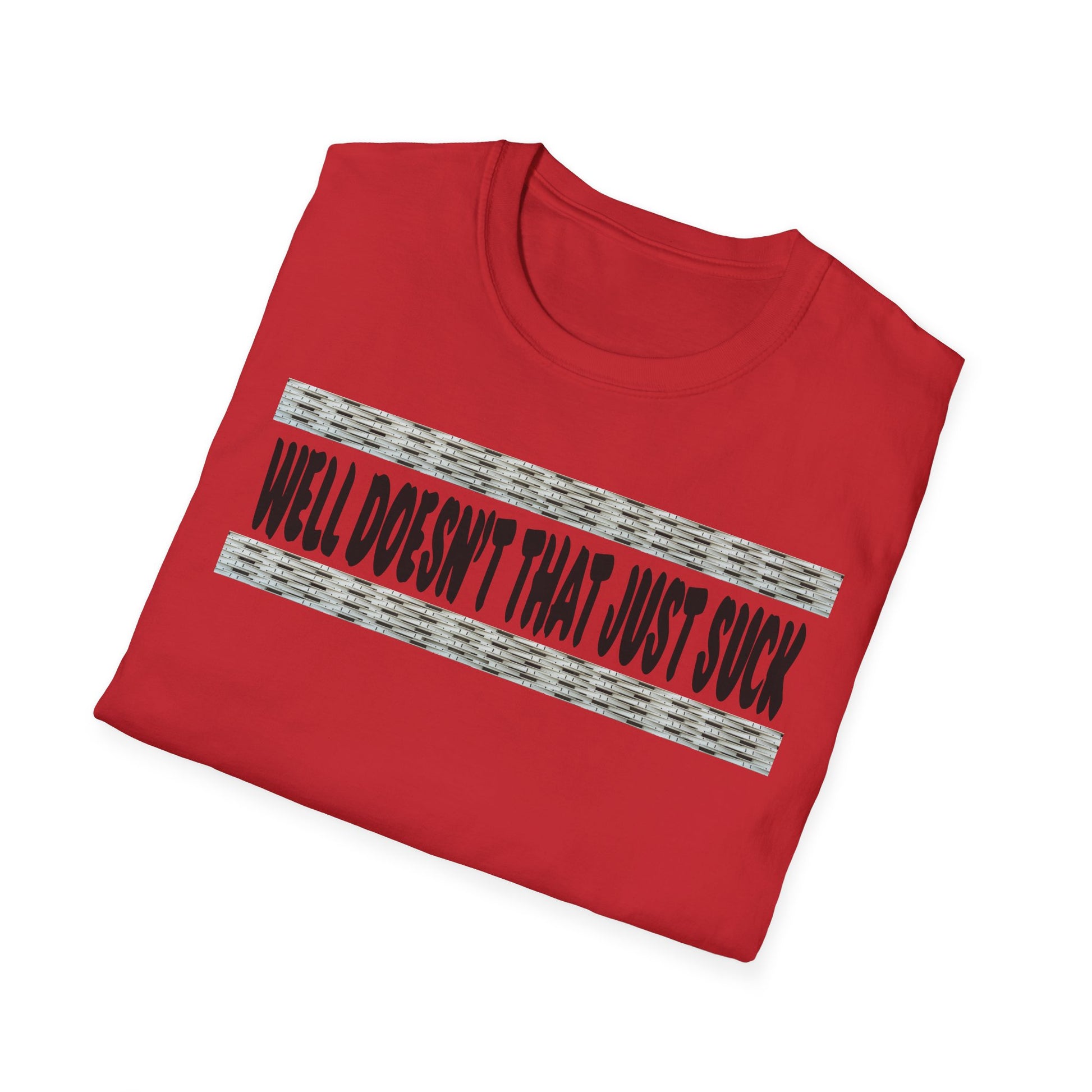 Well doesn't that just suck says it all. Experience everyday comfort with this unisex softstyle t-shirt, designed for those who appreciate both style and ease. The lightweight fabric feels blissful against the skin, making it perfect for year-round wear. This shirt features a classic fit, allowing it to effortlessly transition from casual outings to semi-formal gatherings. The unique design adds a touch of humor to any wardrobe, making it a perfect gift for friends or loved ones who enjoy a good laugh.