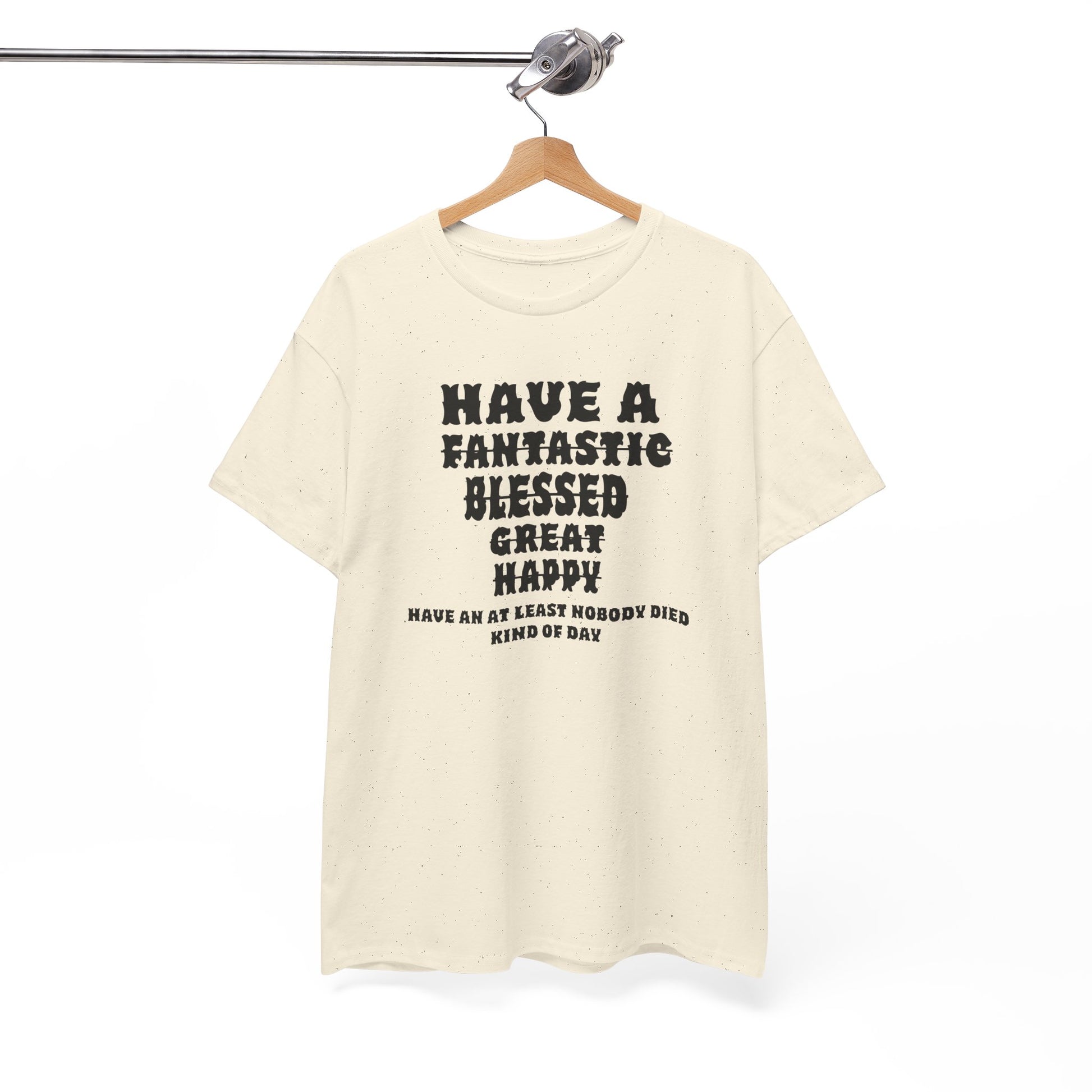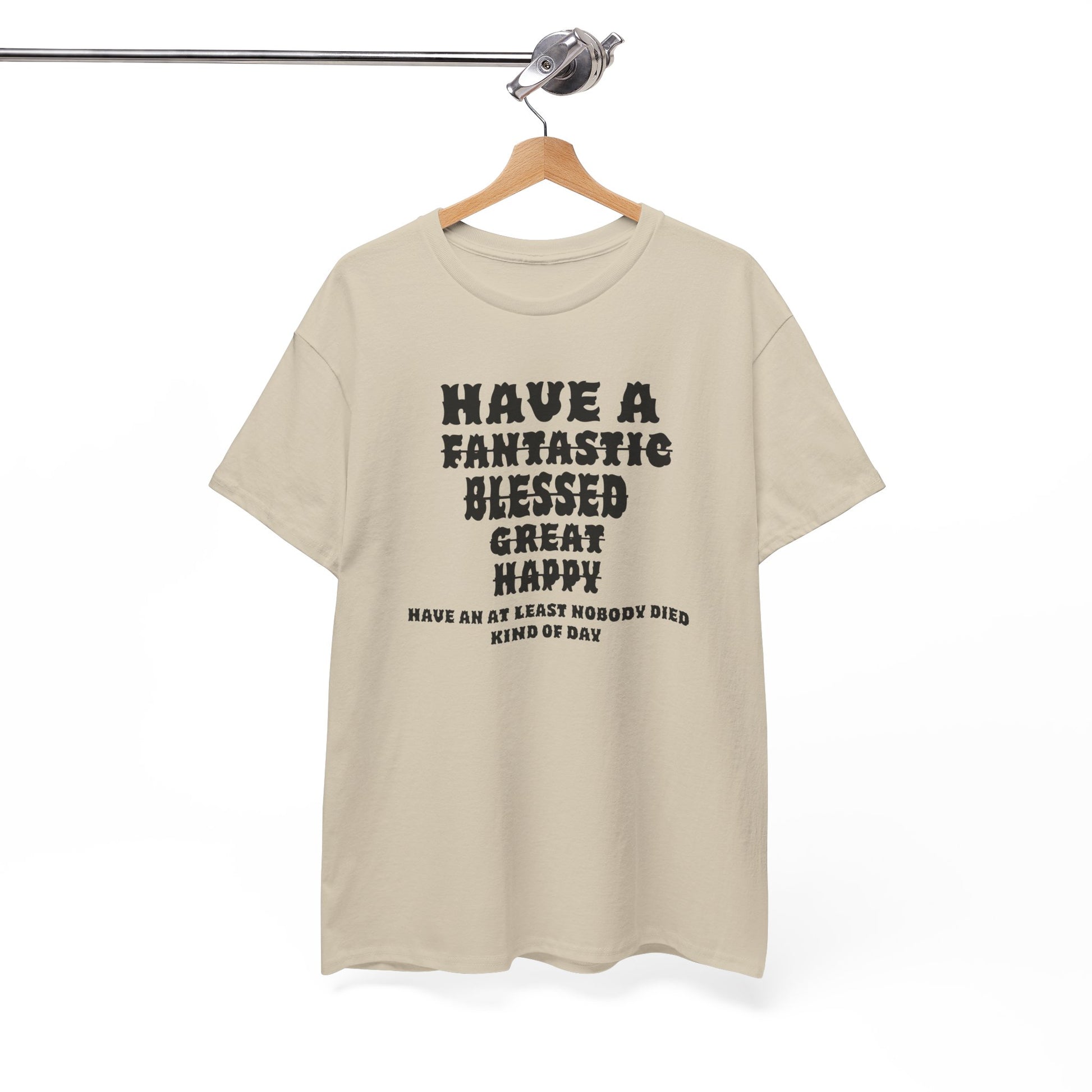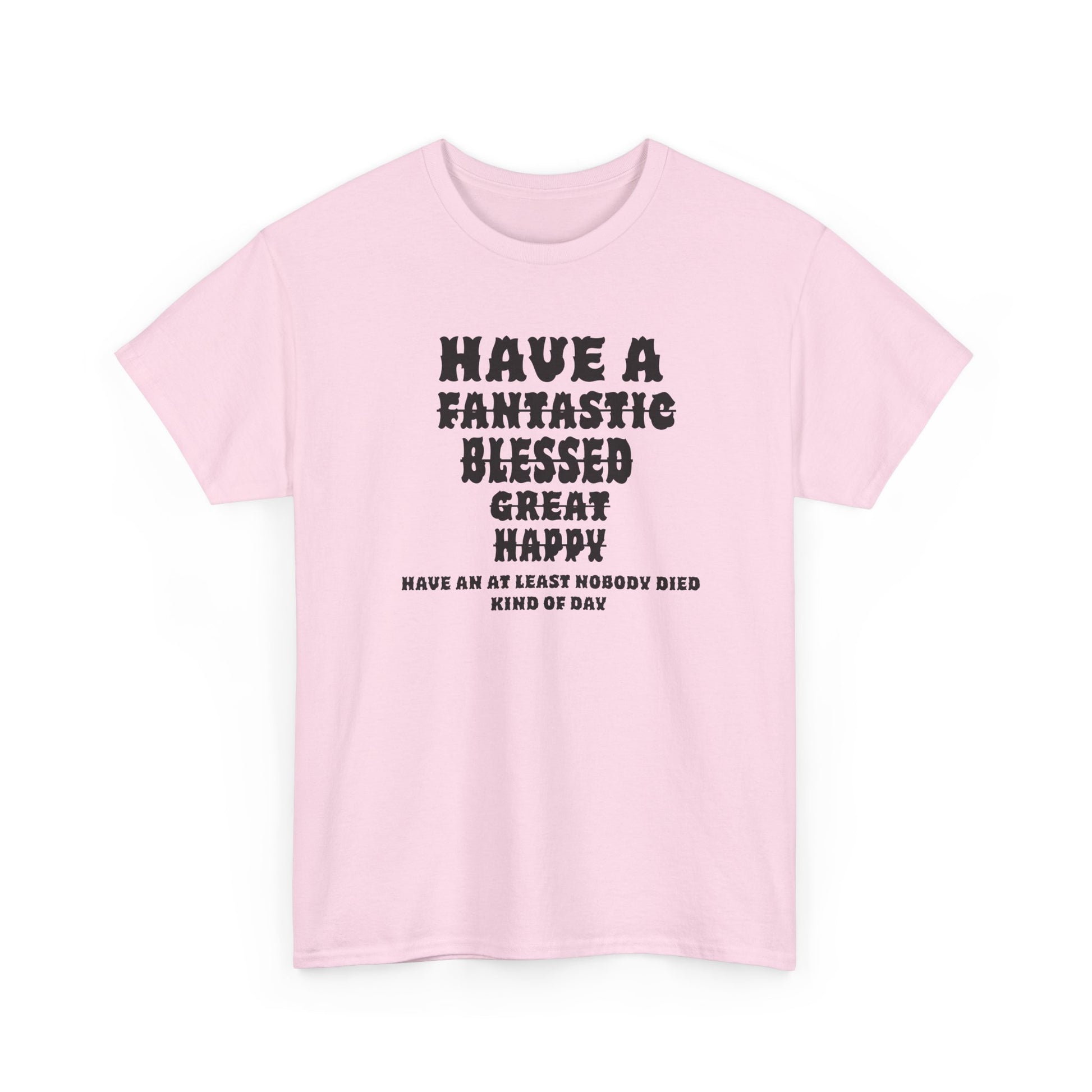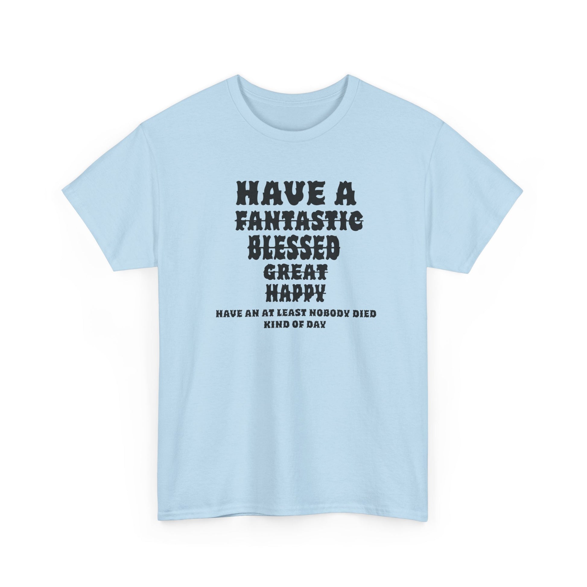 This T-Shirt features a simple yet quirky design that says "Have an at least nobody died kind of day", giving off a casual and humorous vibe. Perfect for those looking for a light-hearted and relaxed addition to their wardrobe. Suitable for adults, this tee is ideal for everyday wear and can be a conversation starter. Relevant for casual Fridays, weekends, and hanging out with friends.