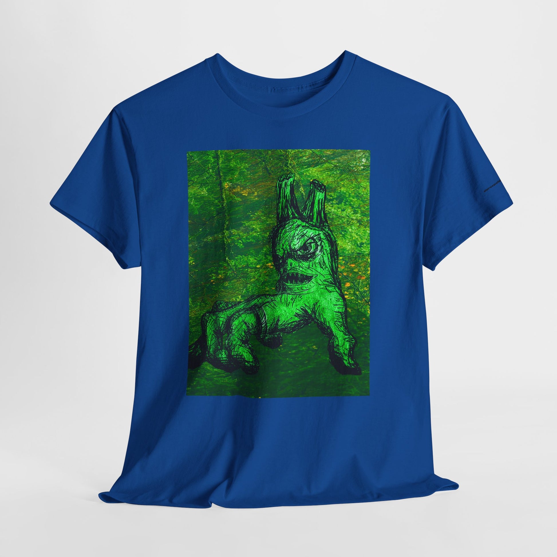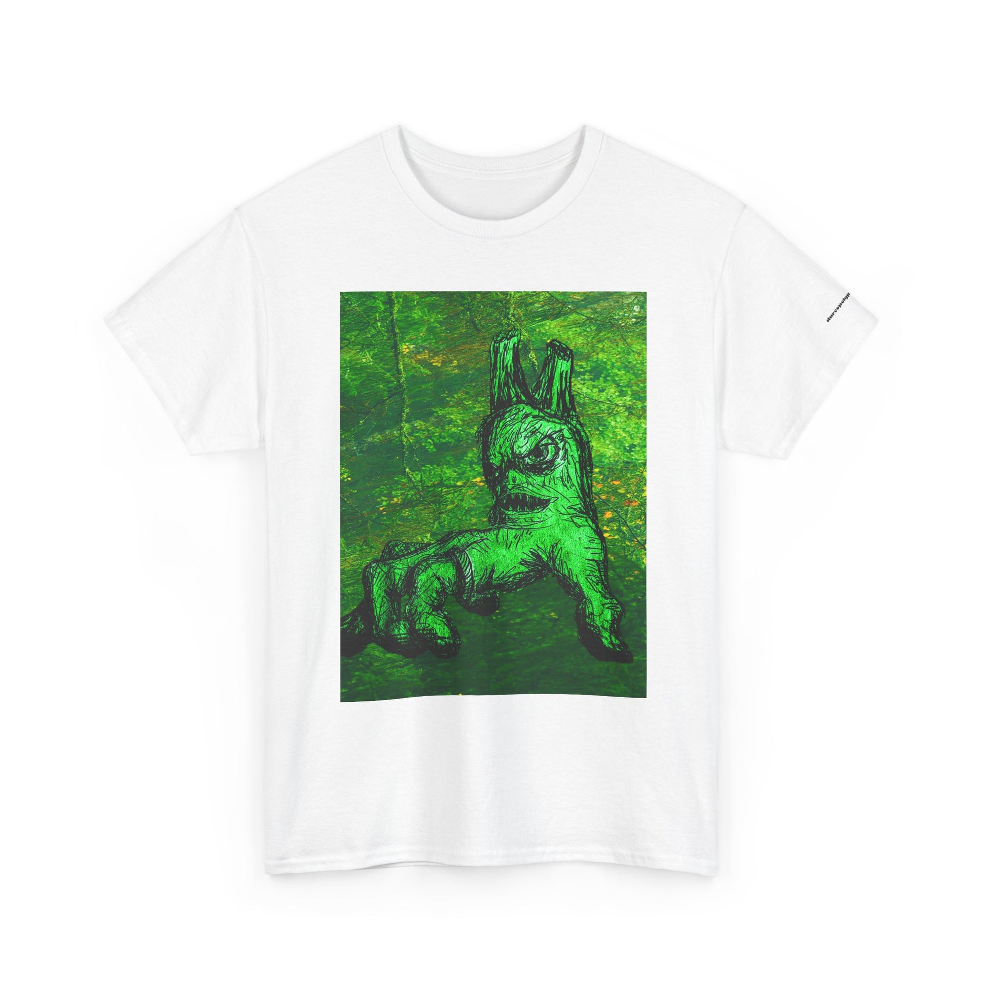 This classic cotton tee carries a bold, slightly surreal green artwork at its center — a mossy, dreamlike creature that feels both playful and mysterious. The medium-weight fabric and relaxed, classic fit make it comfortable to wear all day, while the ribbed crew neck and shoulder taping keep the silhouette steady after repeated washes. Wear it when you want your outfit to spark conversation: the print reads like a found painting, perfect for someone who likes art-forward streetwear with an offbeat, nature-touched edge. The tear-away label and ethically sourced cotton add small comforts that let the design take center stage.