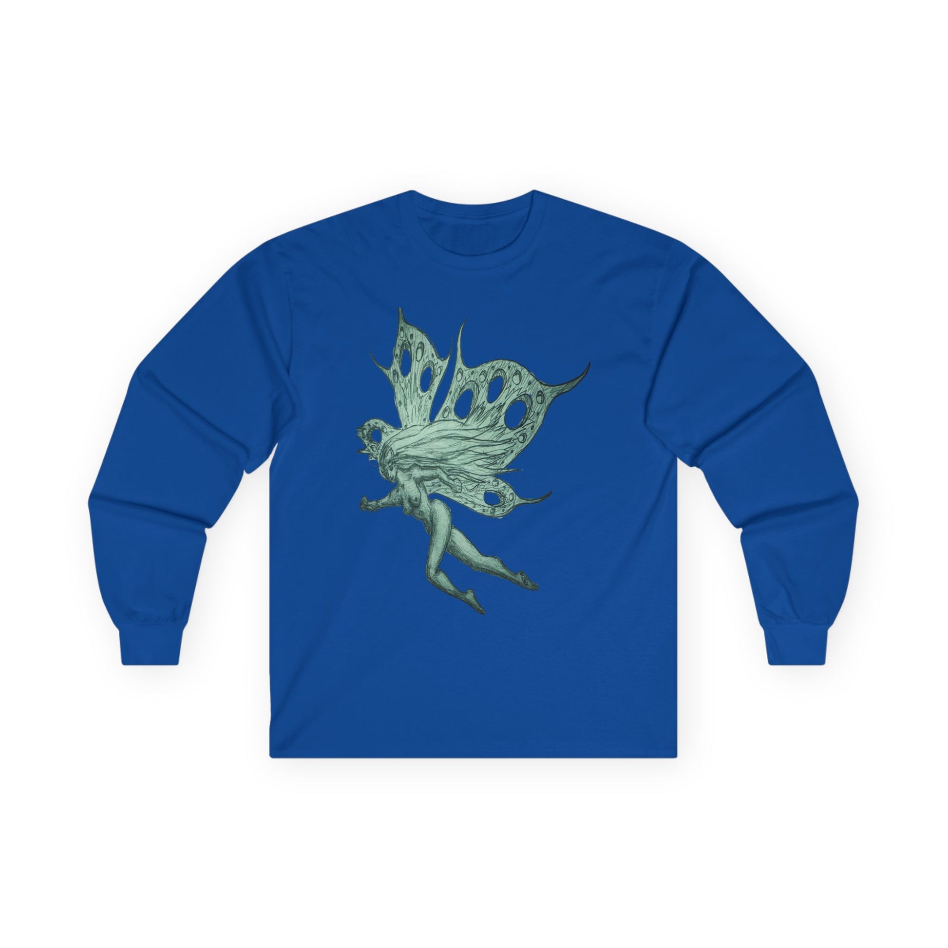 Lightweight yet sturdy, this long-sleeve tee carries a hand-drawn green fairy at its center — delicate wings with organic, slightly tattered edges and a quietly adventurous pose. Wear it on chilly mornings for slow walks through damp parks, layered under a worn denim jacket while crate-digging at record shops, or curled up with a sketchbook and a mug. The design feels like an old storybook moment brought into everyday life: wistful, curious, and a little wild. It settles into the wardrobe as a gentle statement piece that reads as both nostalgic and modern, blending soft vintage texture with a touch of woodland magic.
