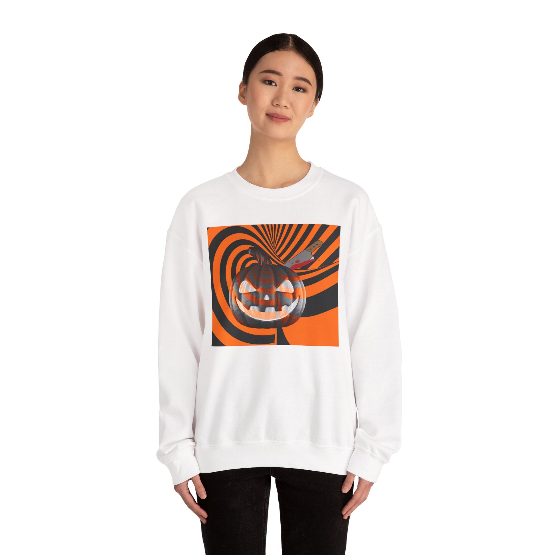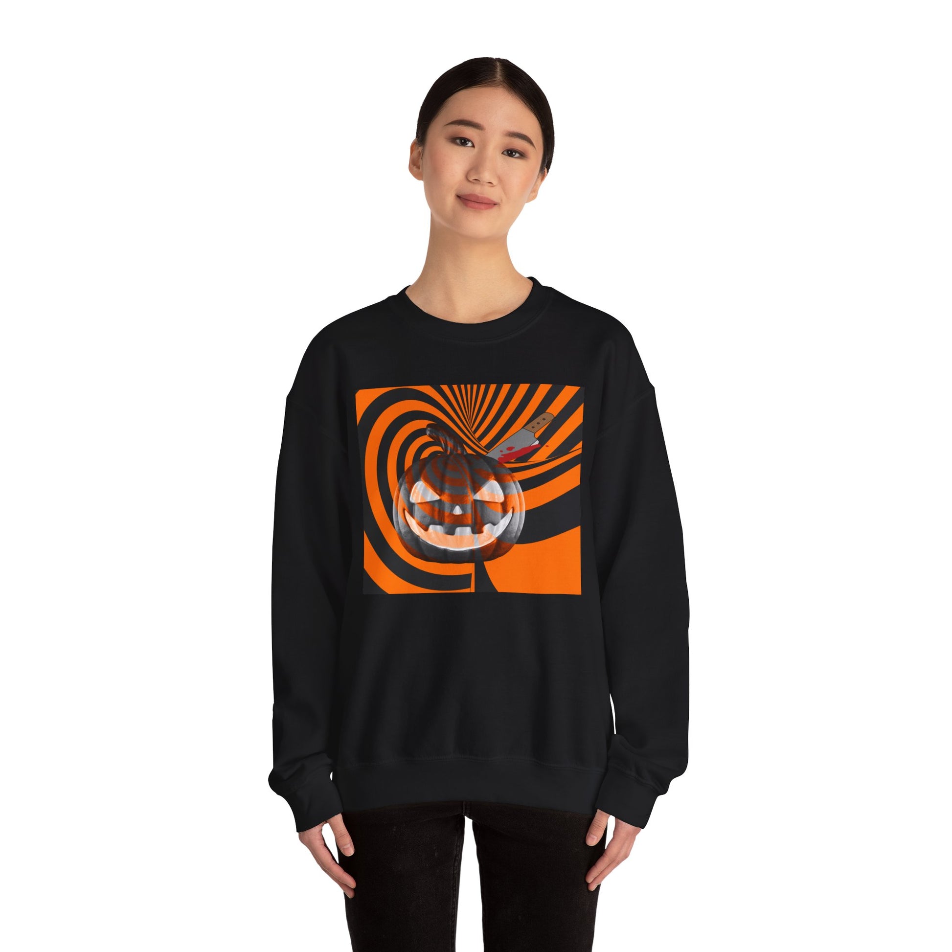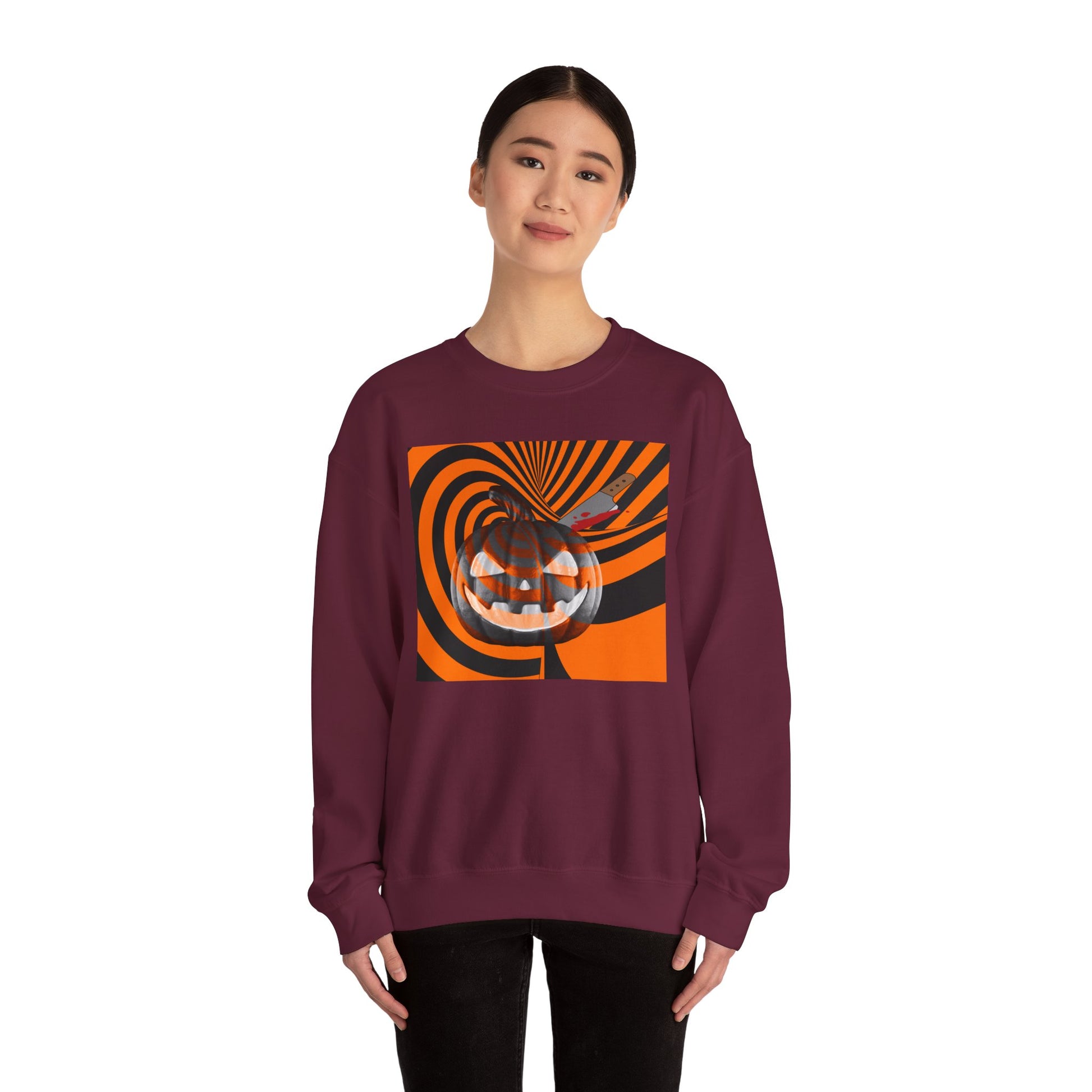 This crazy pumpkin with a knife in his head design gives off a spooky and Halloween vibe, perfect for those who love unique and eerie themes. This unisex heavy blend crewneck sweatshirt is ideal for adults looking to add a touch of Halloween spirit to their wardrobe. It's great for Halloween parties, haunted house visits, o