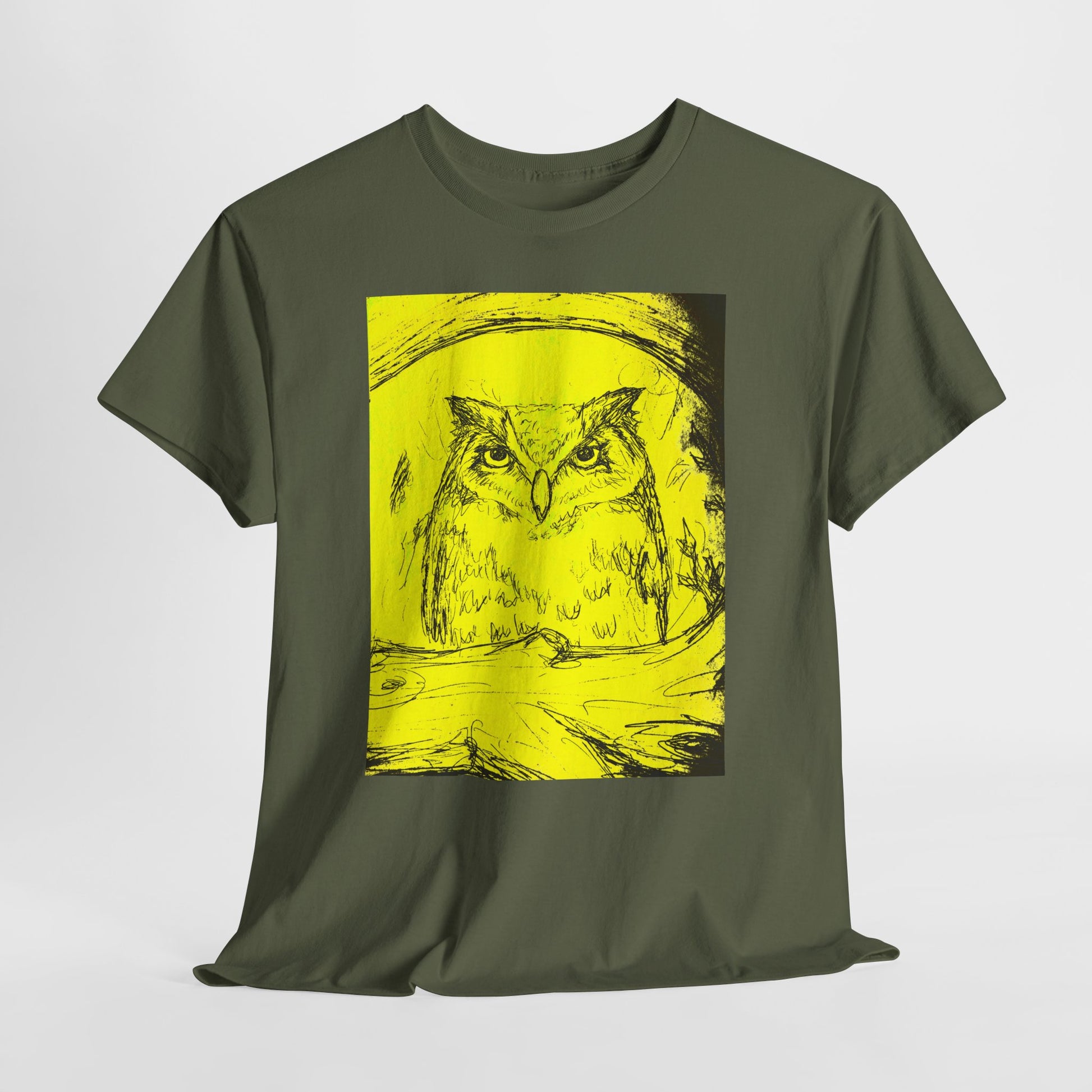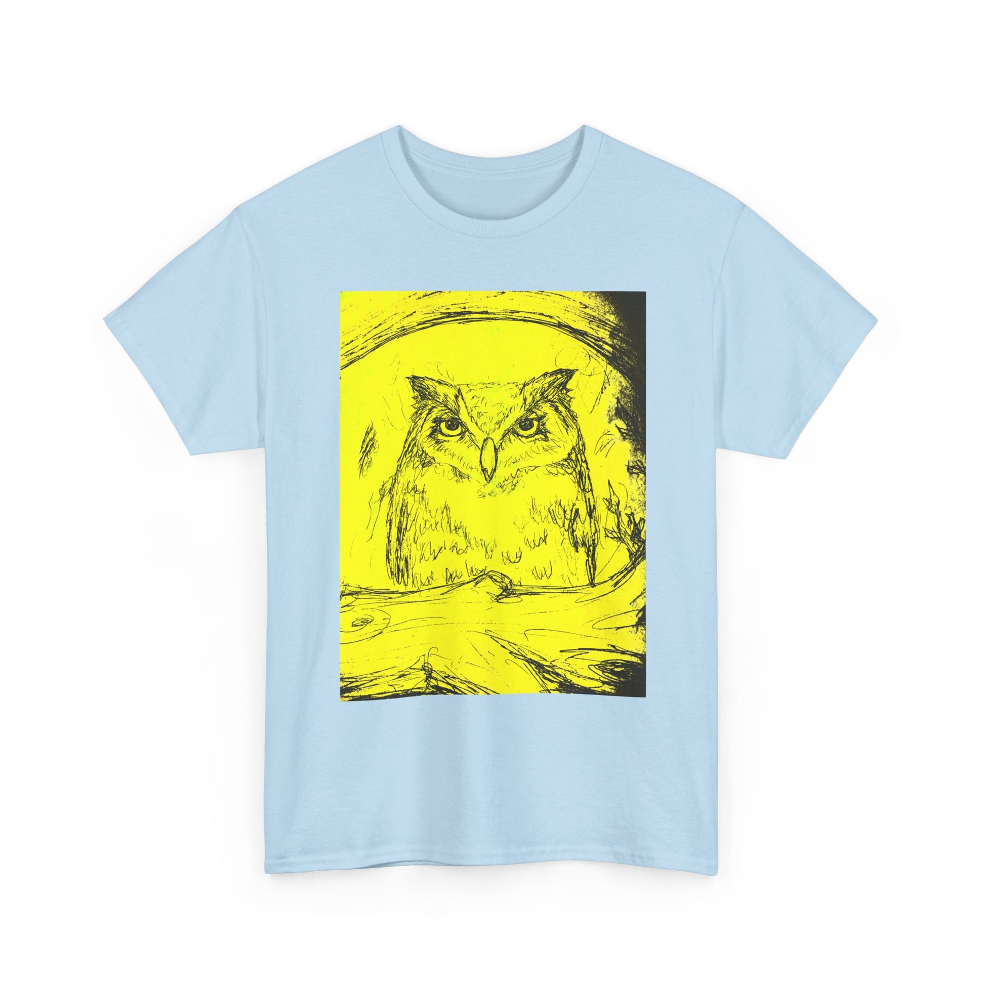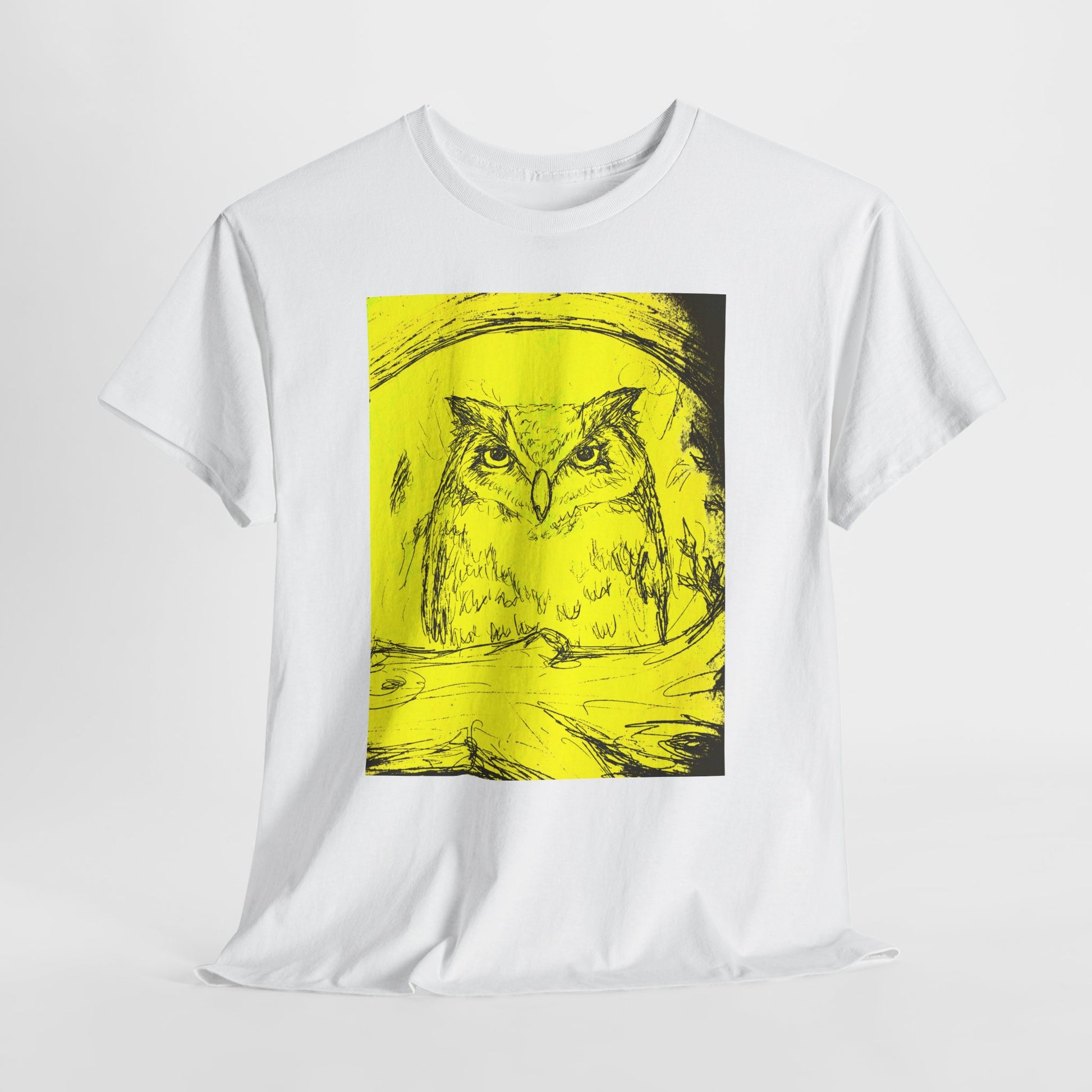 Hand drawn yellow owl sketch by local large Chris Cleveland The Gildan 5000 heavy cotton tee is a dependable classic made for everyday wear and custom printing. Its 100% cotton fabric is tightly knit to give designs sharper detail and long-lasting color. The seamless body eliminates side seams for a smoother fit, while reinforced shoulders keep the shirt in shape through repeated washes. Durable, comfortable, and print-friendly, the Gildan 5000 is a trusted staple for personalized apparel.