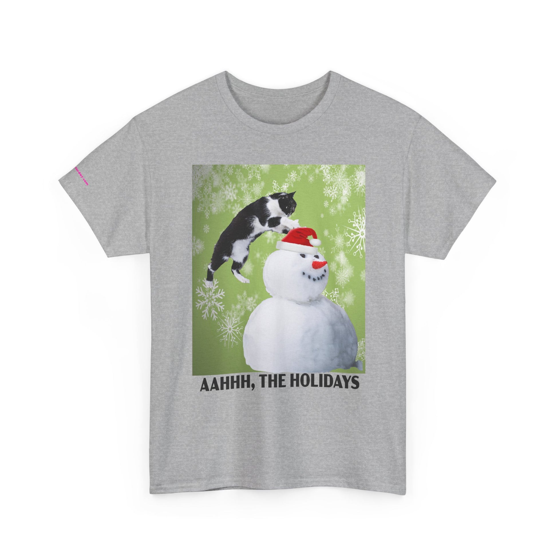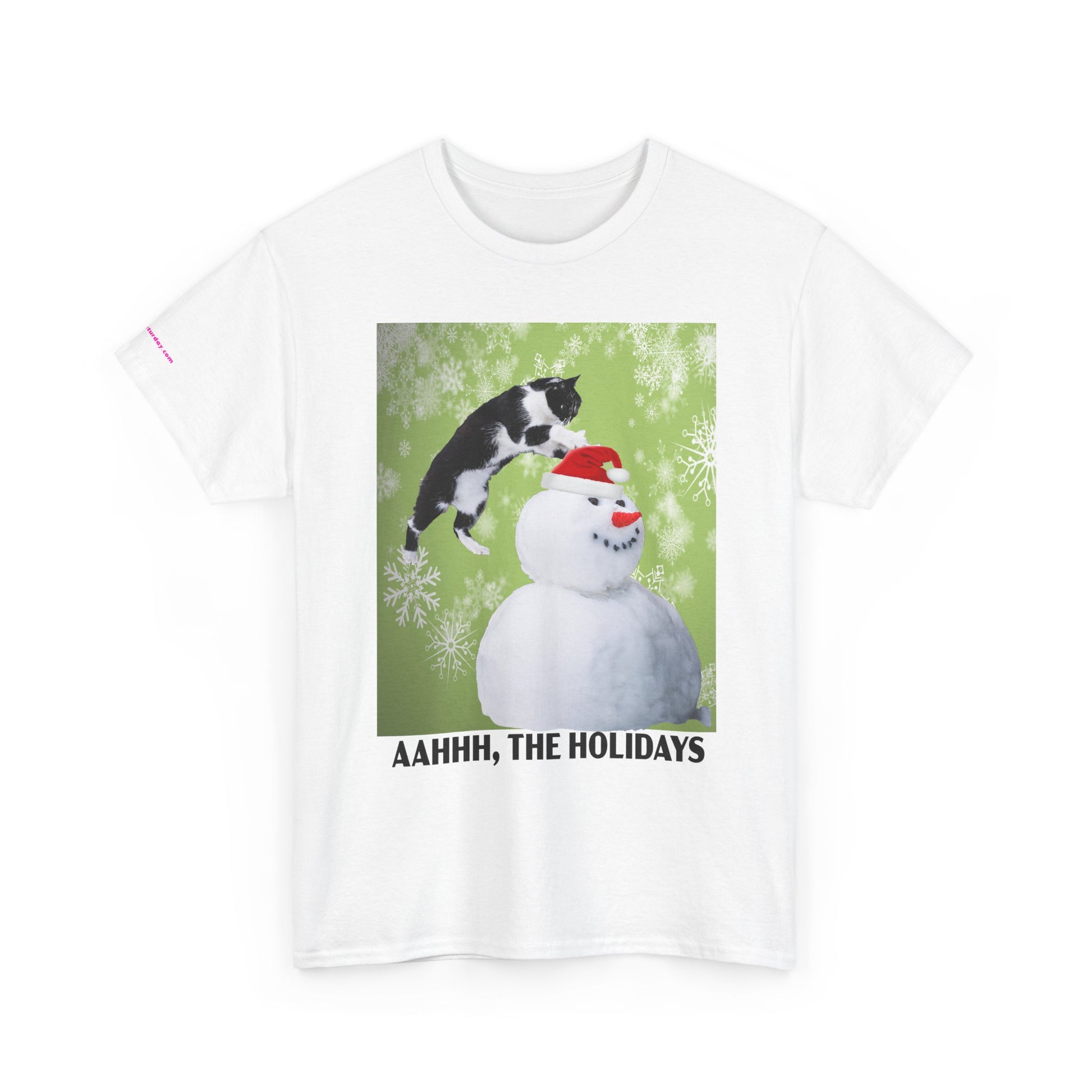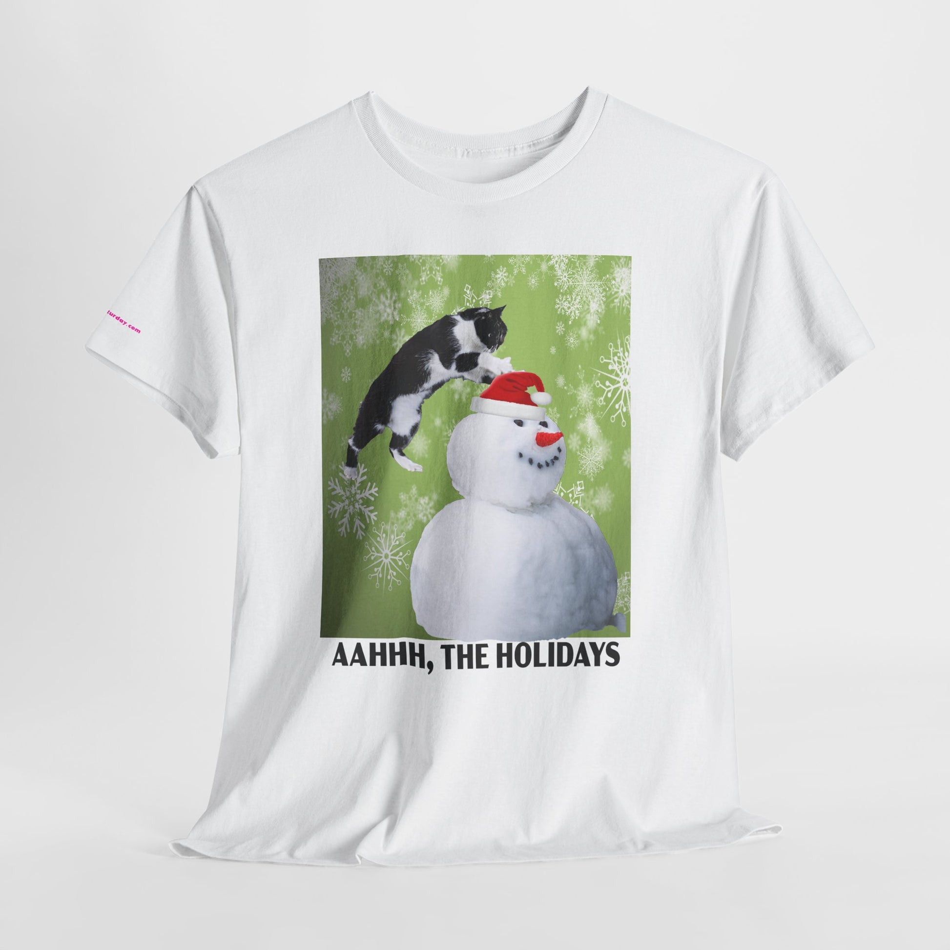A playful holiday tee that brings a little mischief to winter gatherings. Soft, sturdy cotton and a classic crew neck carry a bright print of a curious cat leaping onto a snowman against a frosty green backdrop. The image and cheeky caption “AAHHH, THE HOLIDAYS” capture the warm chaos of seasonal get-togethers — snowball fights, cuddly pets, and laughter — while keeping the look casual and wearable. It layers easily under coats or pairs with jeans for relaxed holiday outings or cozy nights in.