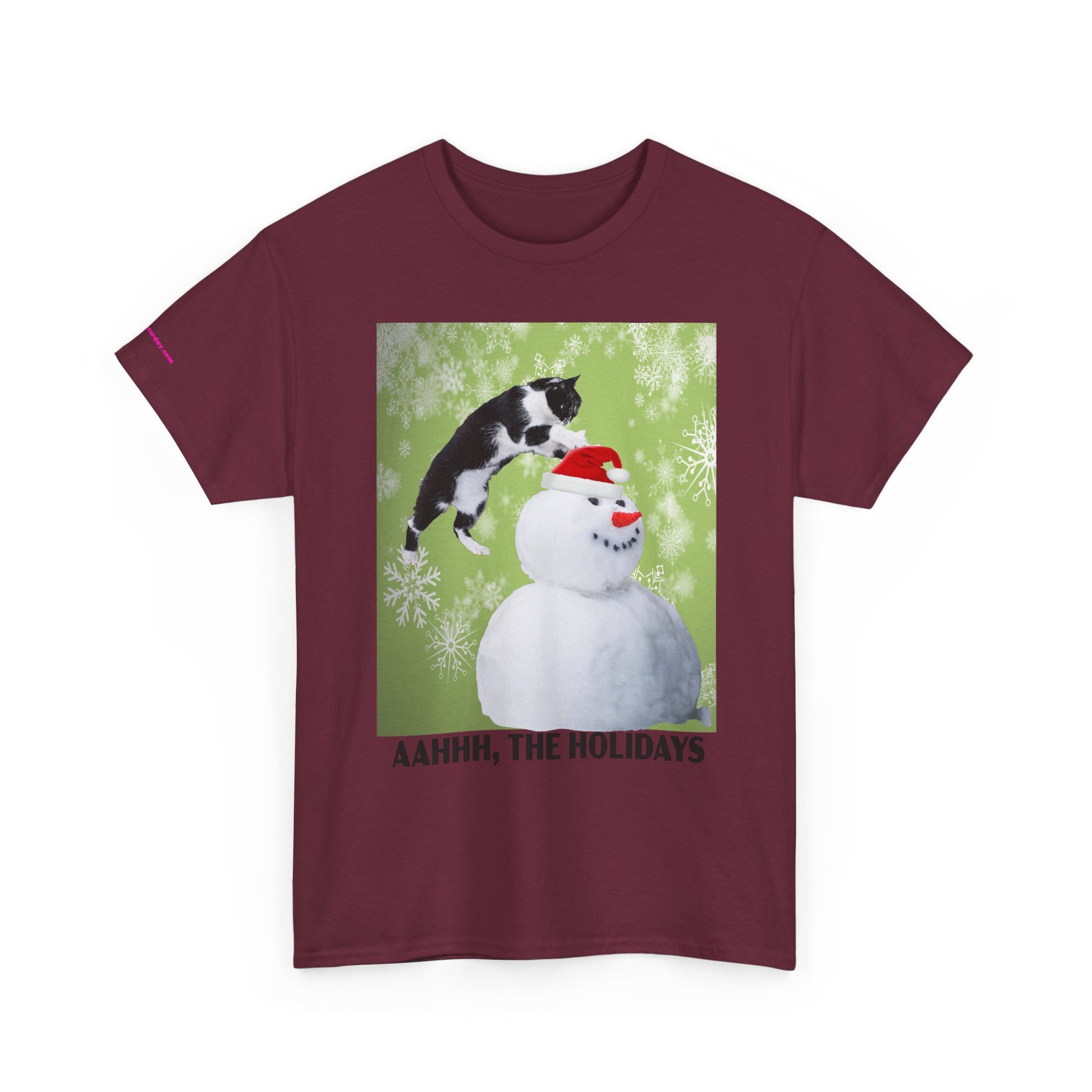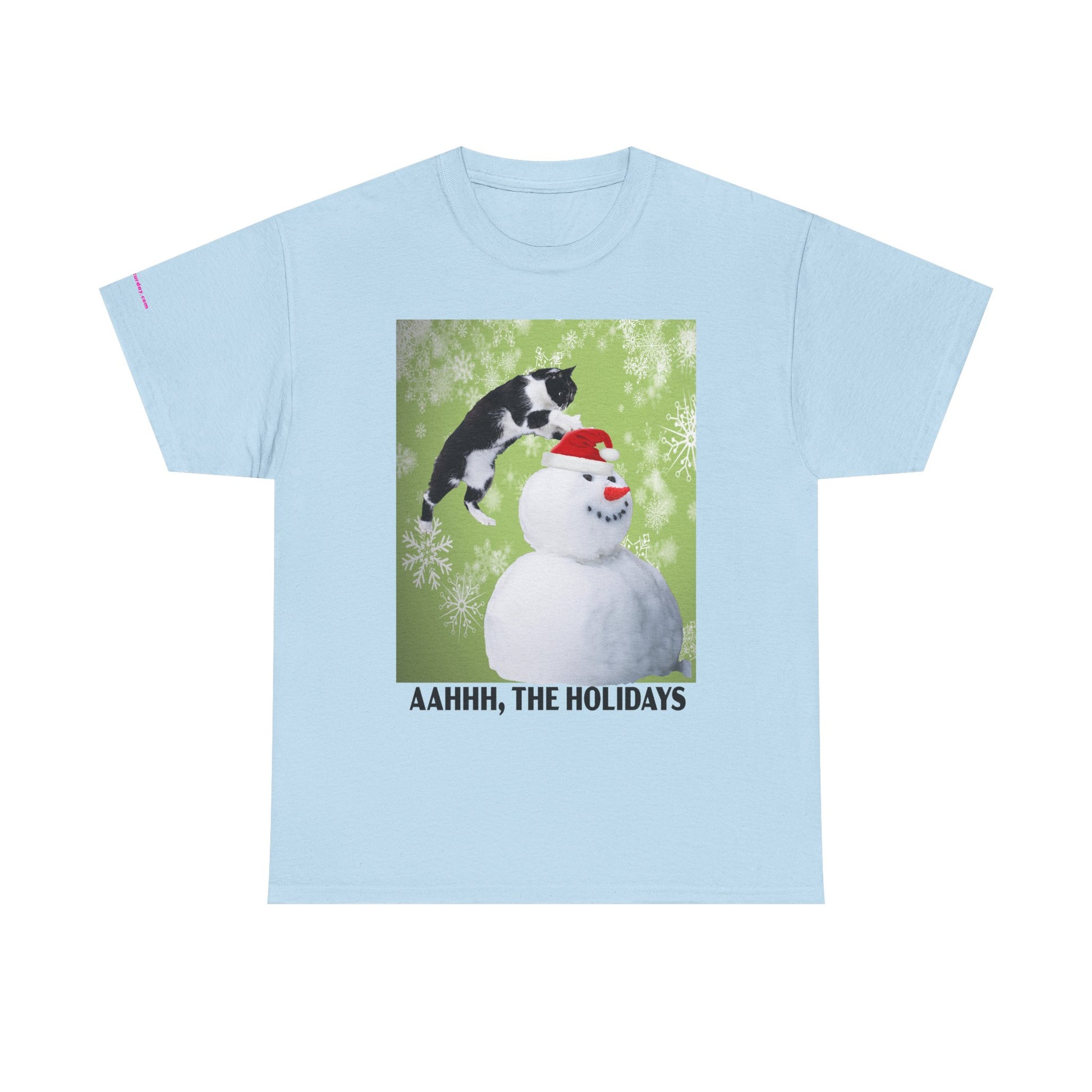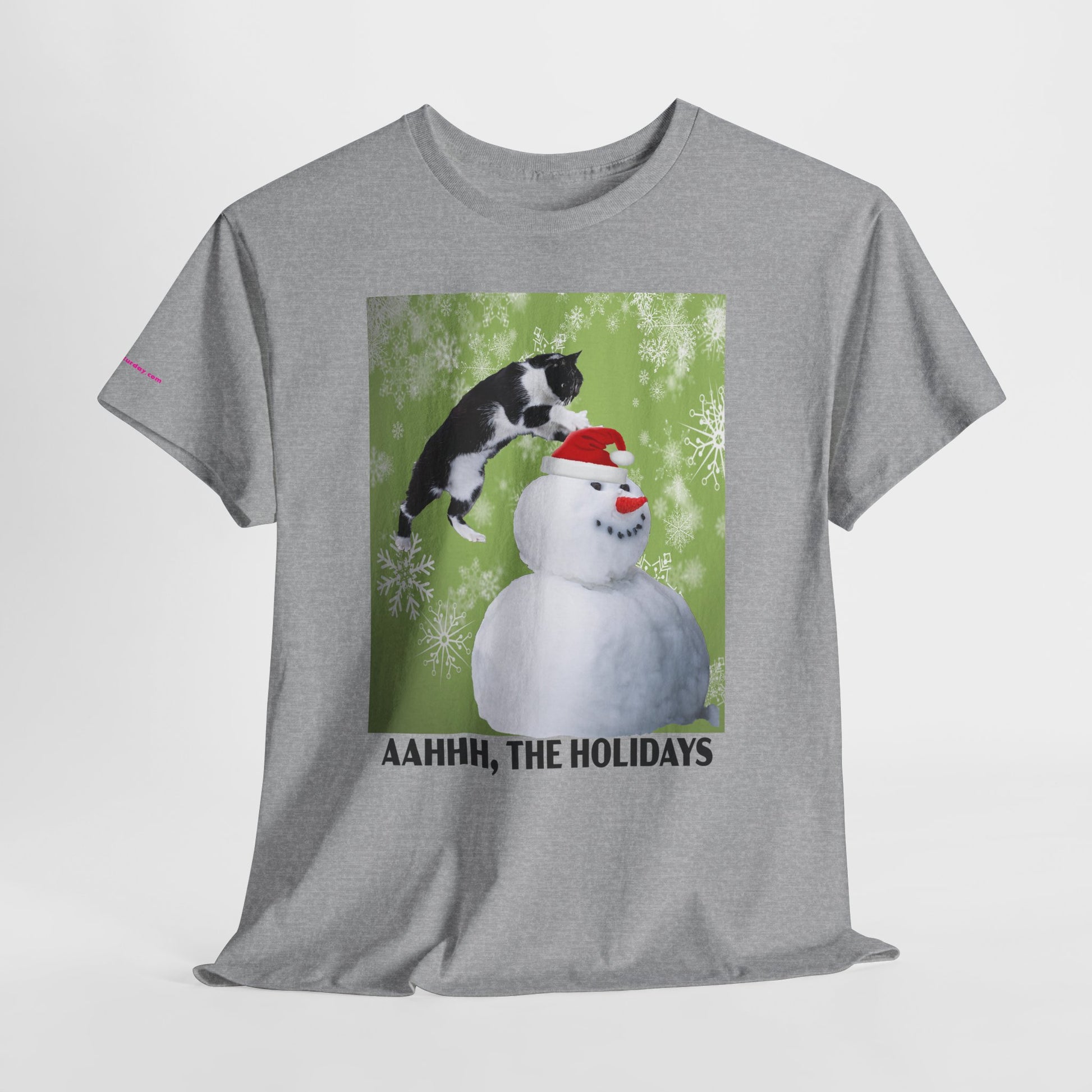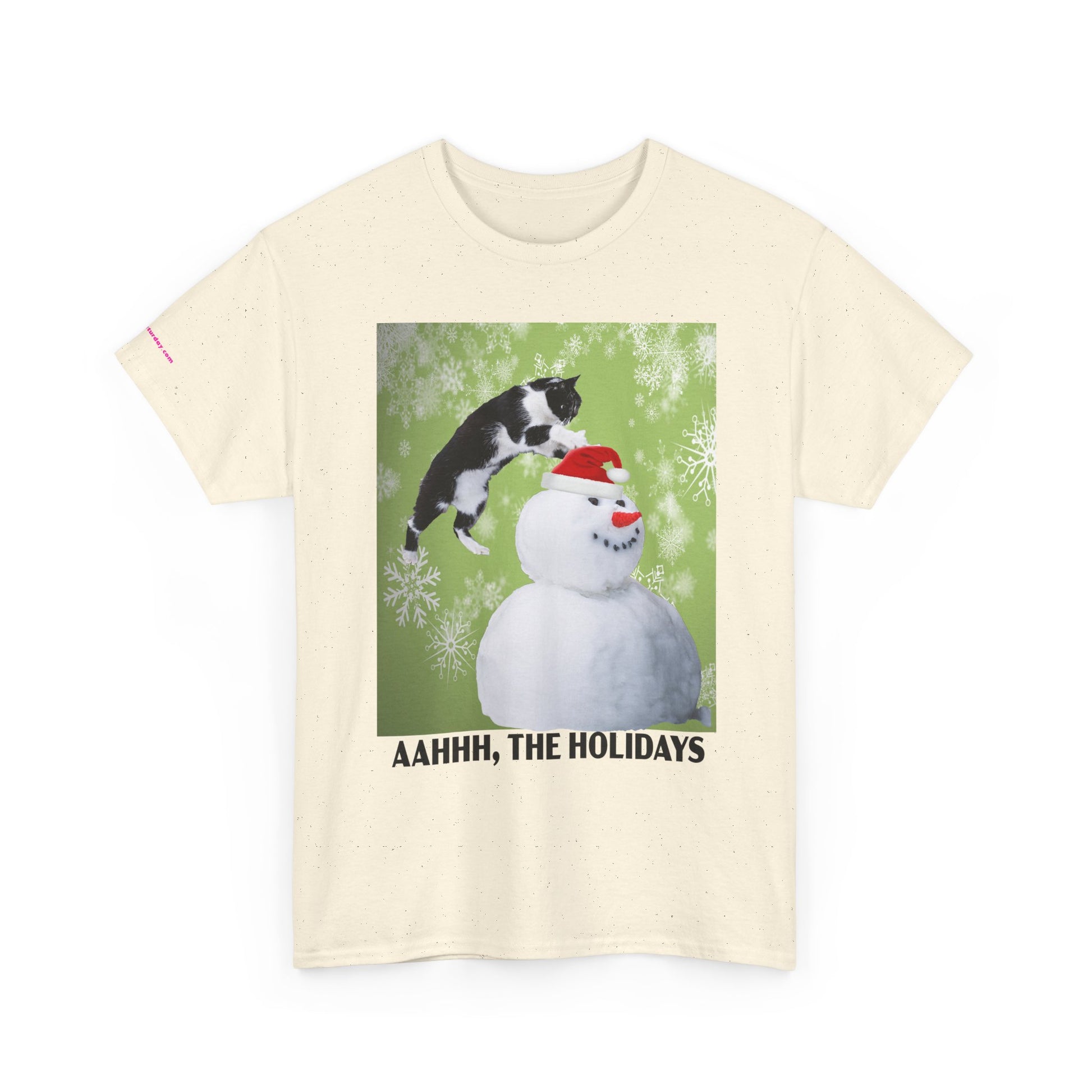 A playful holiday tee that brings a little mischief to winter gatherings. Soft, sturdy cotton and a classic crew neck carry a bright print of a curious cat leaping onto a snowman against a frosty green backdrop. The image and cheeky caption “AAHHH, THE HOLIDAYS” capture the warm chaos of seasonal get-togethers — snowball fights, cuddly pets, and laughter — while keeping the look casual and wearable. It layers easily under coats or pairs with jeans for relaxed holiday outings or cozy nights in.