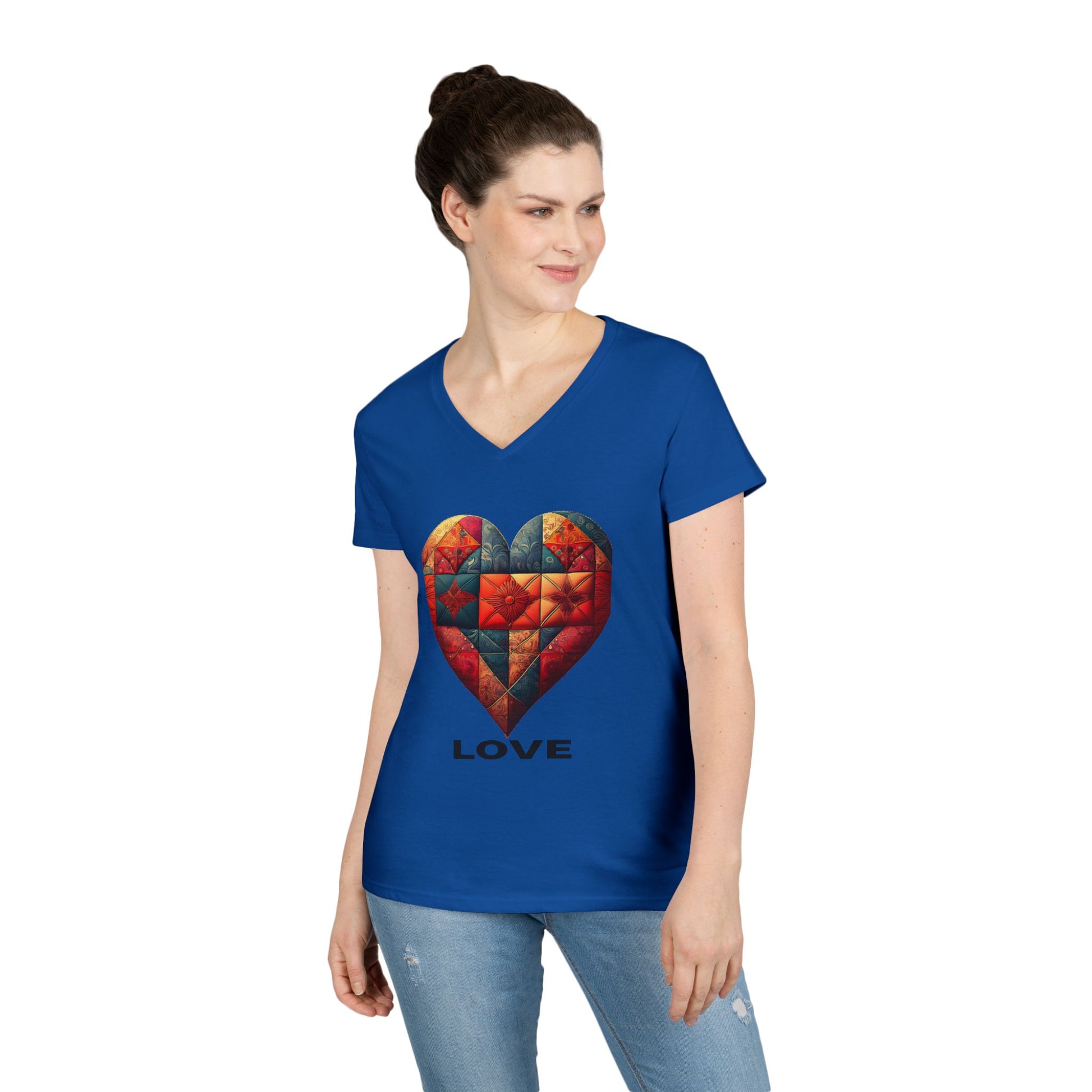 A soft, semi-fitted V-neck tee that carries warmth in its chest. The quilted-heart graphic reads like a stitched memory — patchwork reds, oranges and deep teals come together over the word “LOVE,” giving the shirt a cozy, handmade feel. Wear it on mornings when you want comfort without losing style. The medium-weight 100% cotton holds the print beautifully and the ribbed V-neck, shoulder tape and double-stitched hems keep the silhouette neat after repeated wear. Lightweight enough for layering, yet substantial enough to stand on its own, this tee moves from slow coffee runs to relaxed get-togethers with friends who appreciate thoughtful, crafty design.