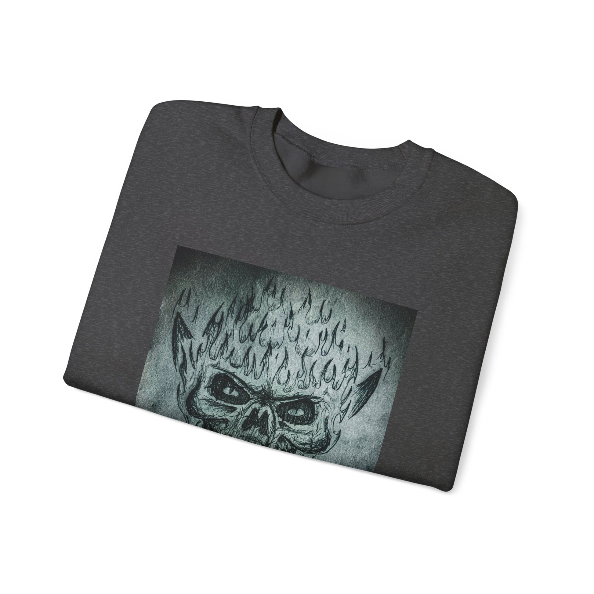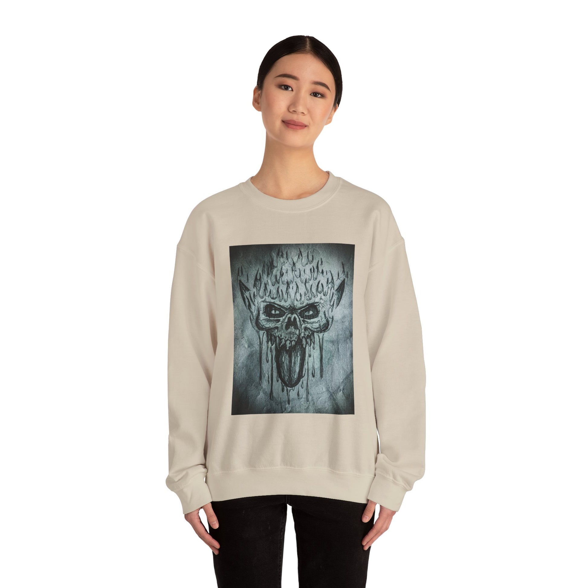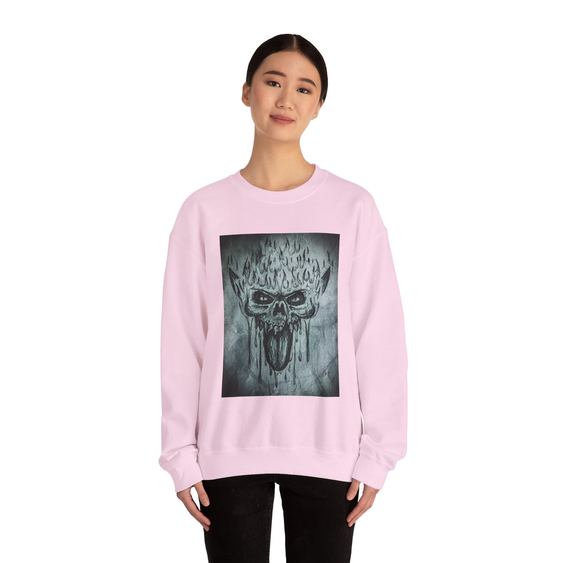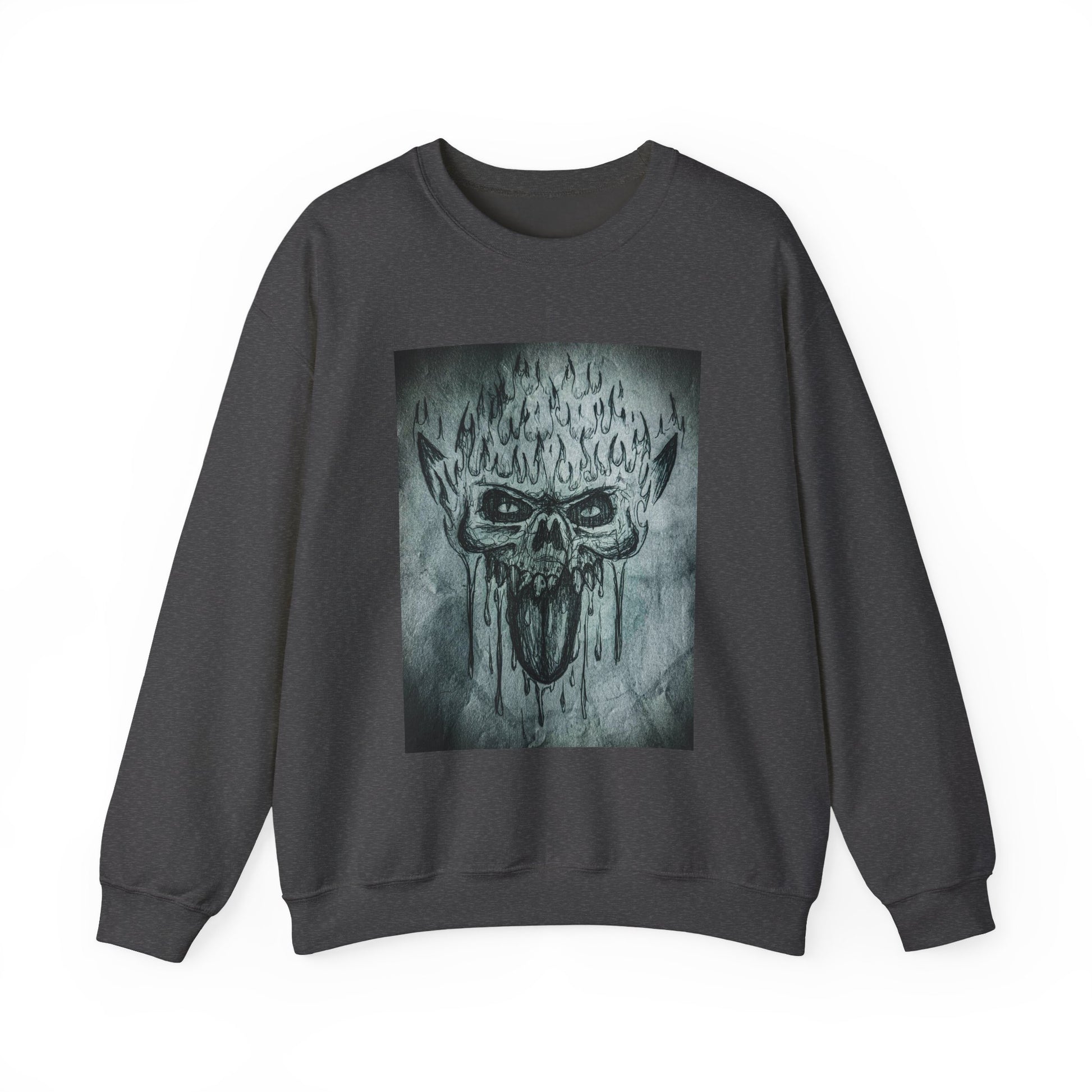 A comfy and durable sweatshirt featuring an original hand drawn scary skull design by Chris Cleveland. This sweatshirt is perfect for adults looking to add a touch of edge to their wardrobe. Ideal for Halloween, gothic fashion enthusiasts, and anyone who loves unique designs.