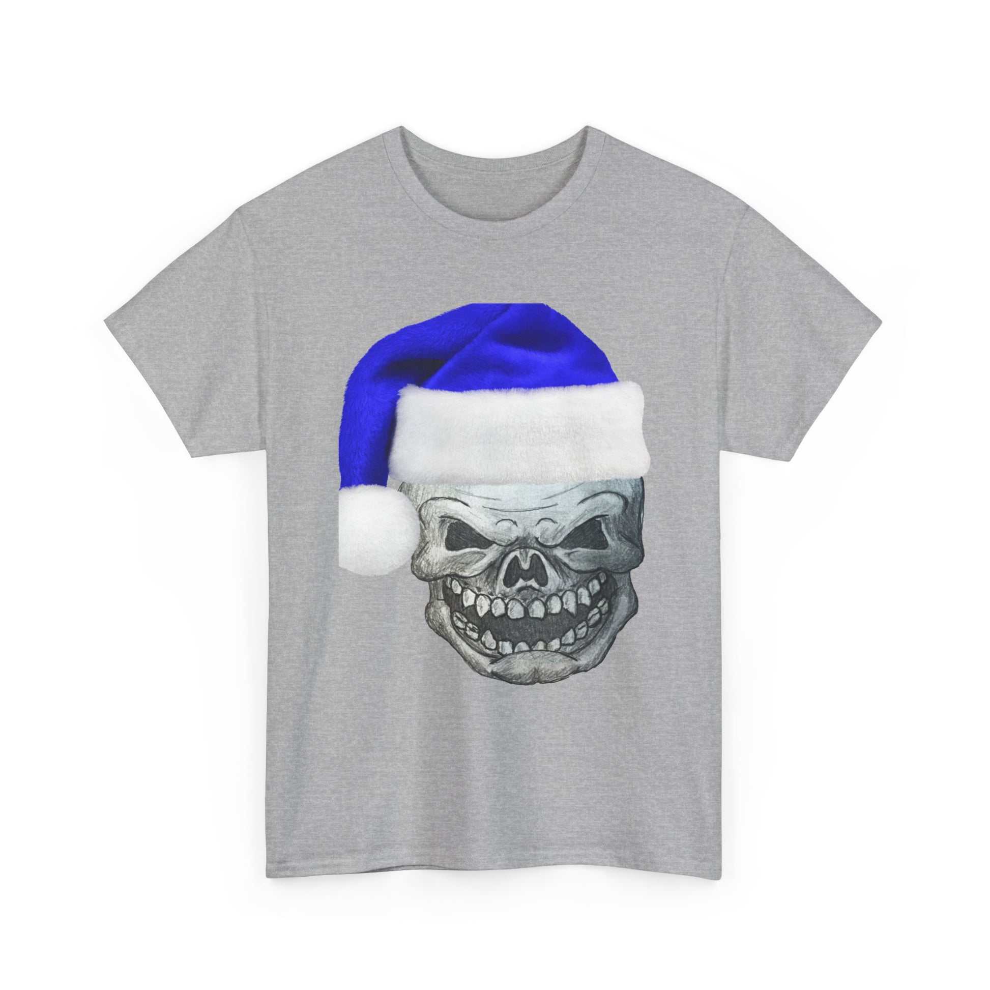 This cotton tee carries a dark-humored holiday vibe: a detailed skull wearing a blue Santa hat sits center chest, balancing gritty edge with seasonal playfulness. The shirt’s medium-weight fabric feels substantial yet breathable, and the crewneck and classic fit keep the silhouette relaxed — easy to layer under a flannel or wear solo at a low-key gathering. The printed inner neck and sleeve details use crisp DTF and DTG techniques so the art reads cleanly against the natural white, while the tear-away label keeps the back of the neck irritation-free. Wear it when you want to shake up typical holiday looks with something that’s equal parts rocker attitude and winter tongue-in-cheek.