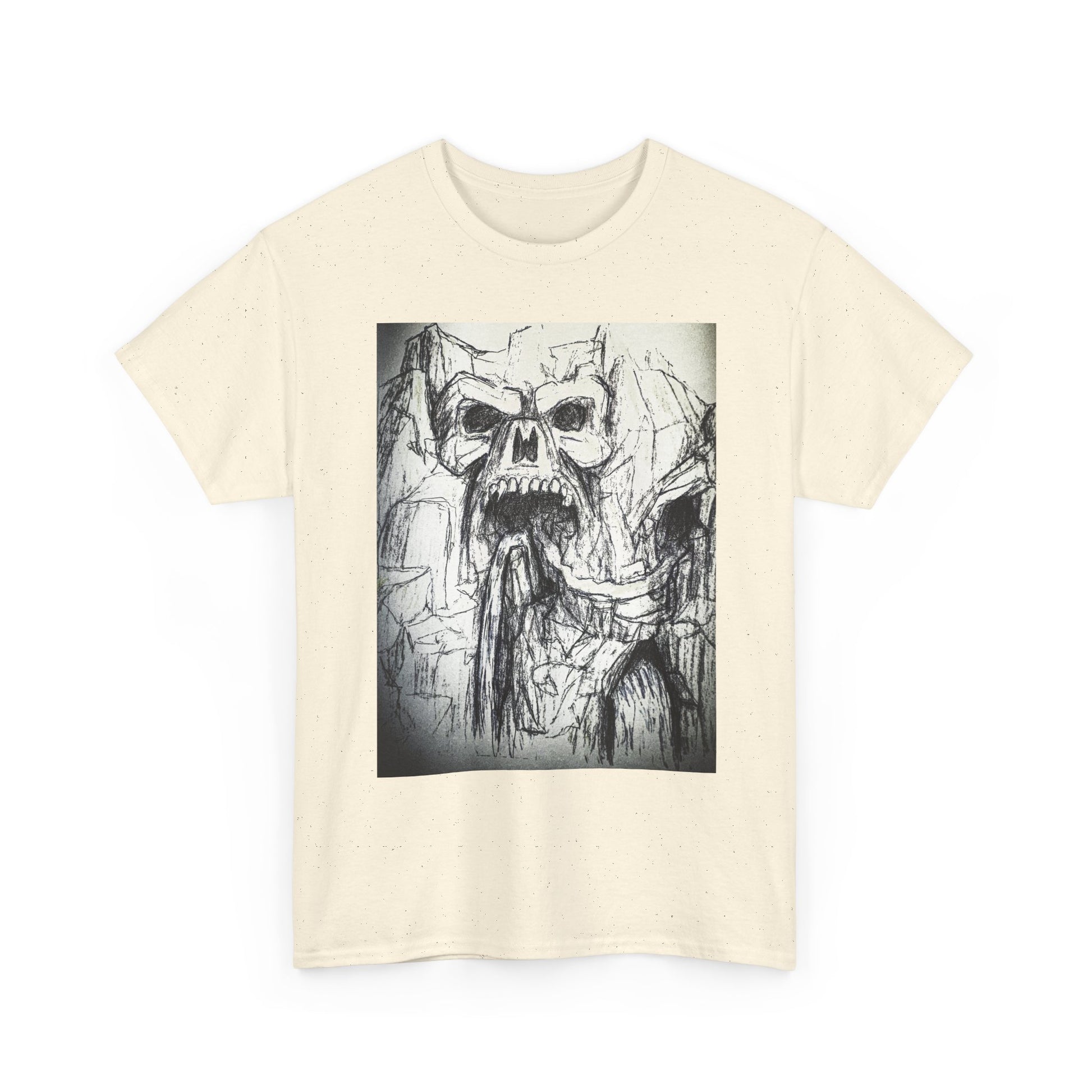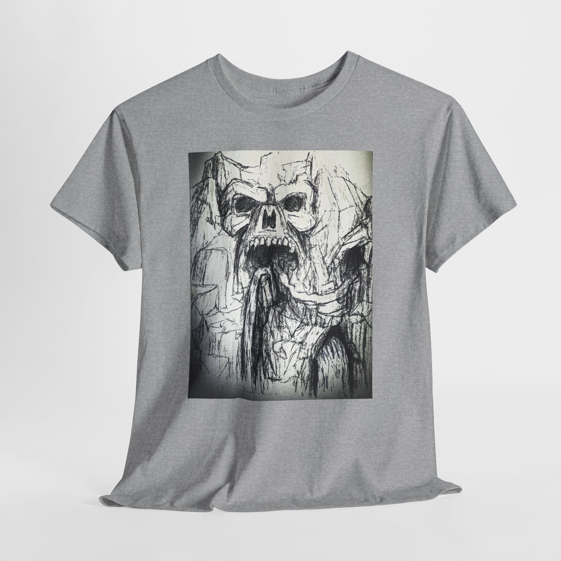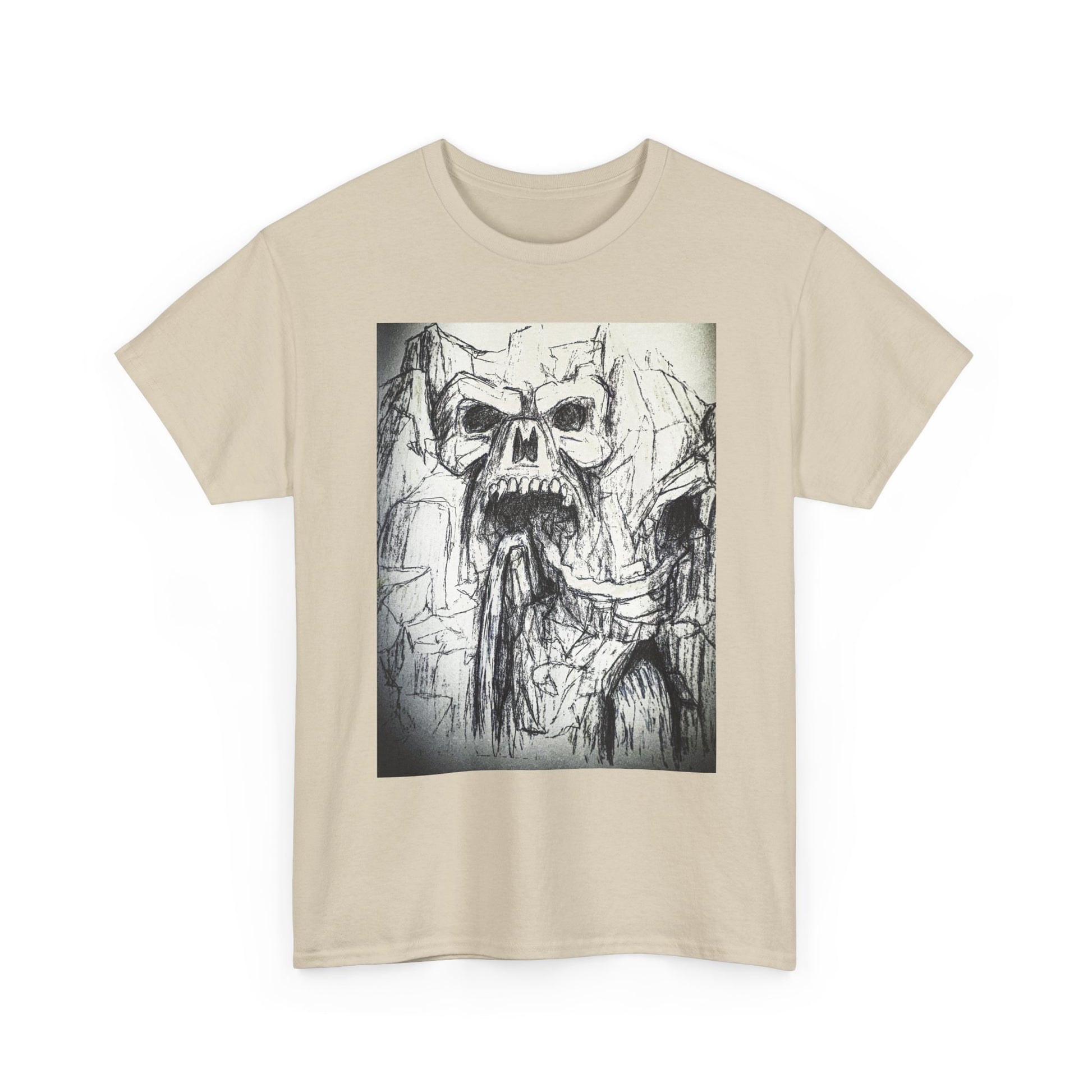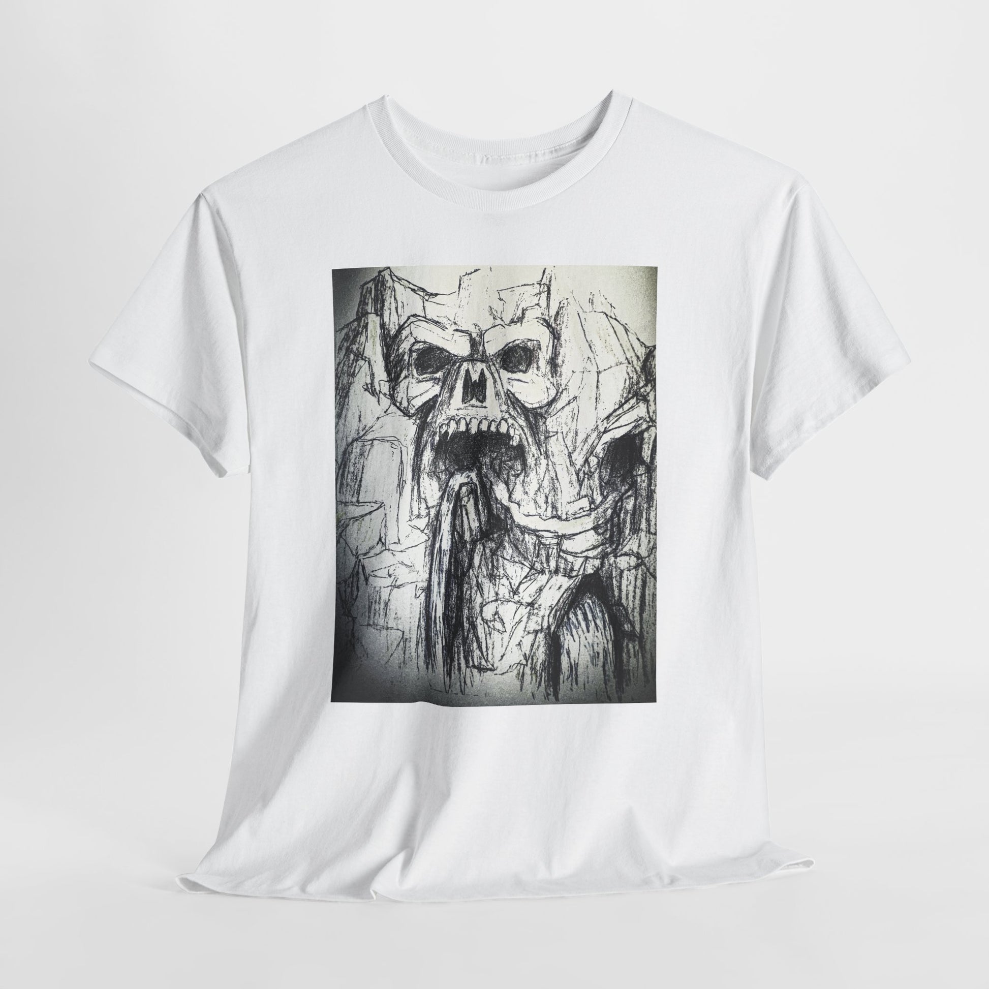 A Tee featuring an epic skull waterfall on a mountain side, perfect for those who love edgy and adventurous designs. Great for casual wear and can be worn by adults. Ideal for Halloween or rock-themed events.