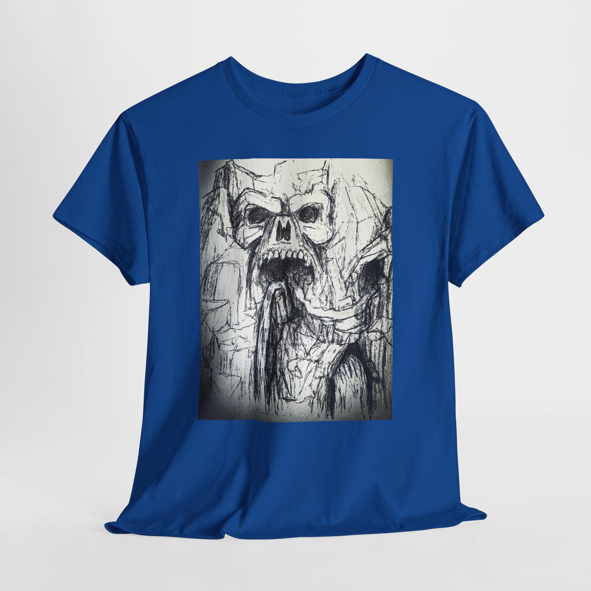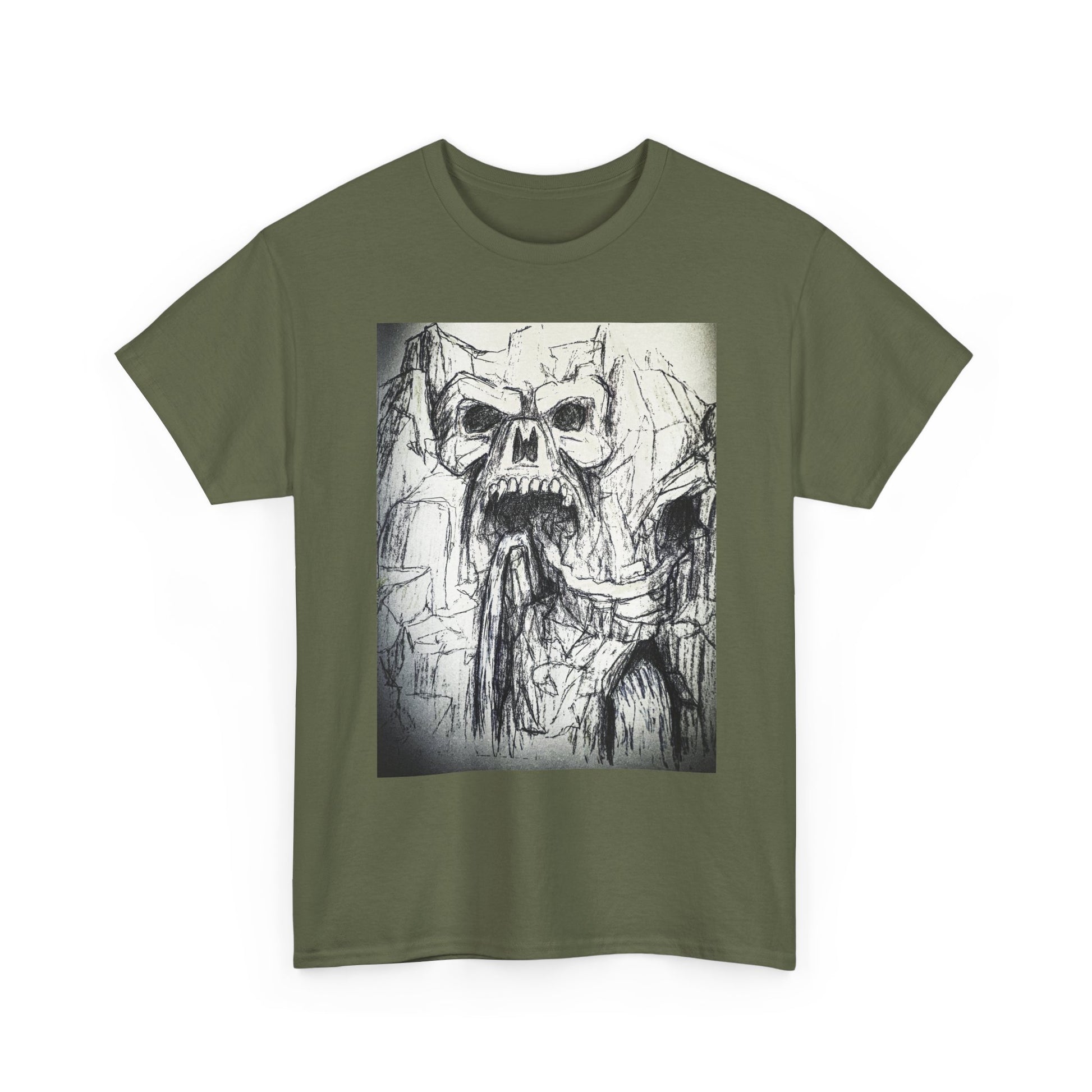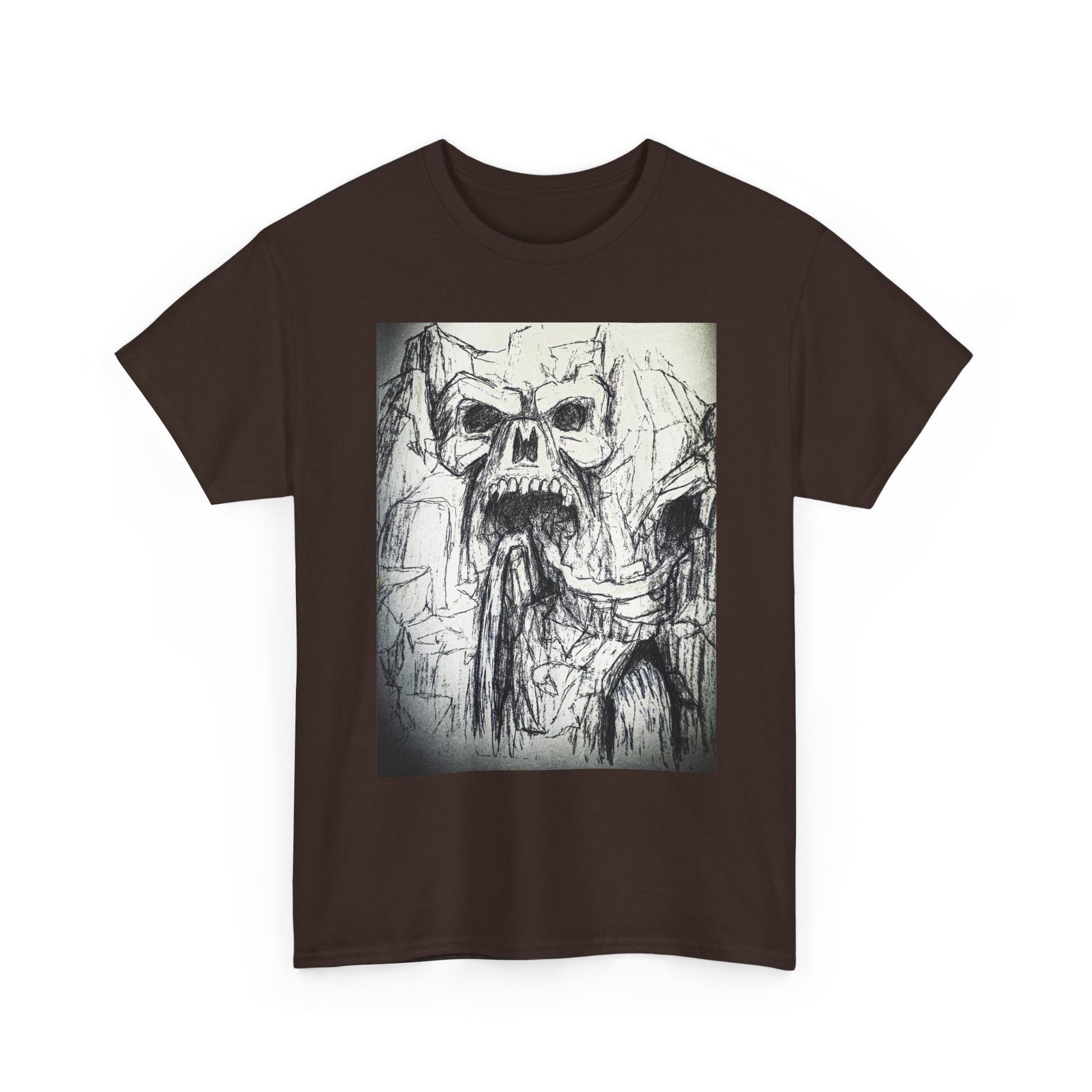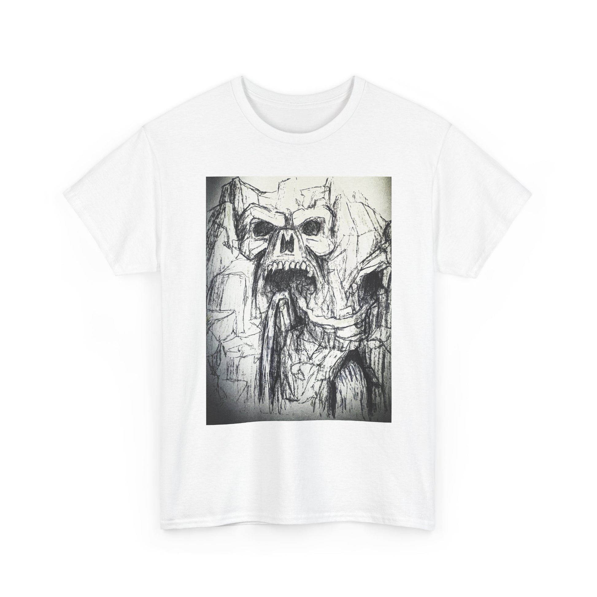 A Tee featuring an epic skull waterfall on a mountain side, perfect for those who love edgy and adventurous designs. Great for casual wear and can be worn by adults. Ideal for Halloween or rock-themed events.