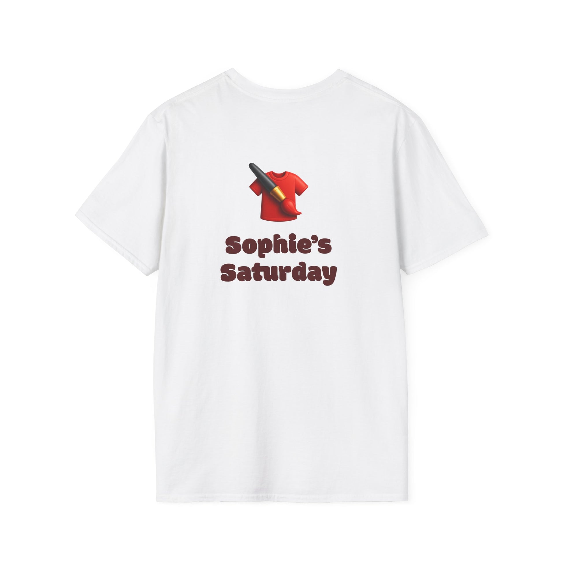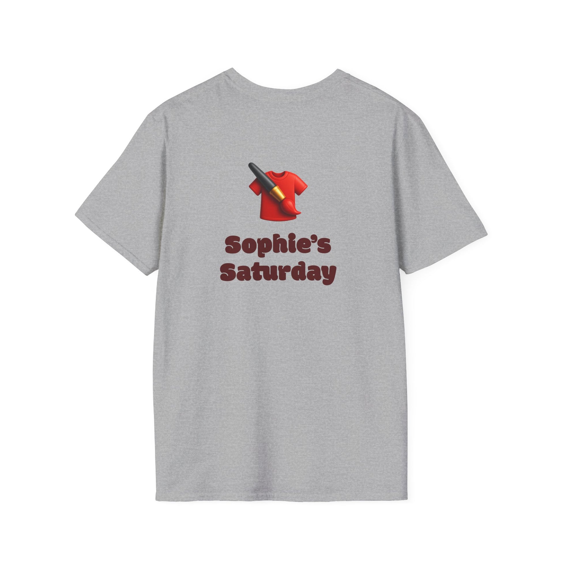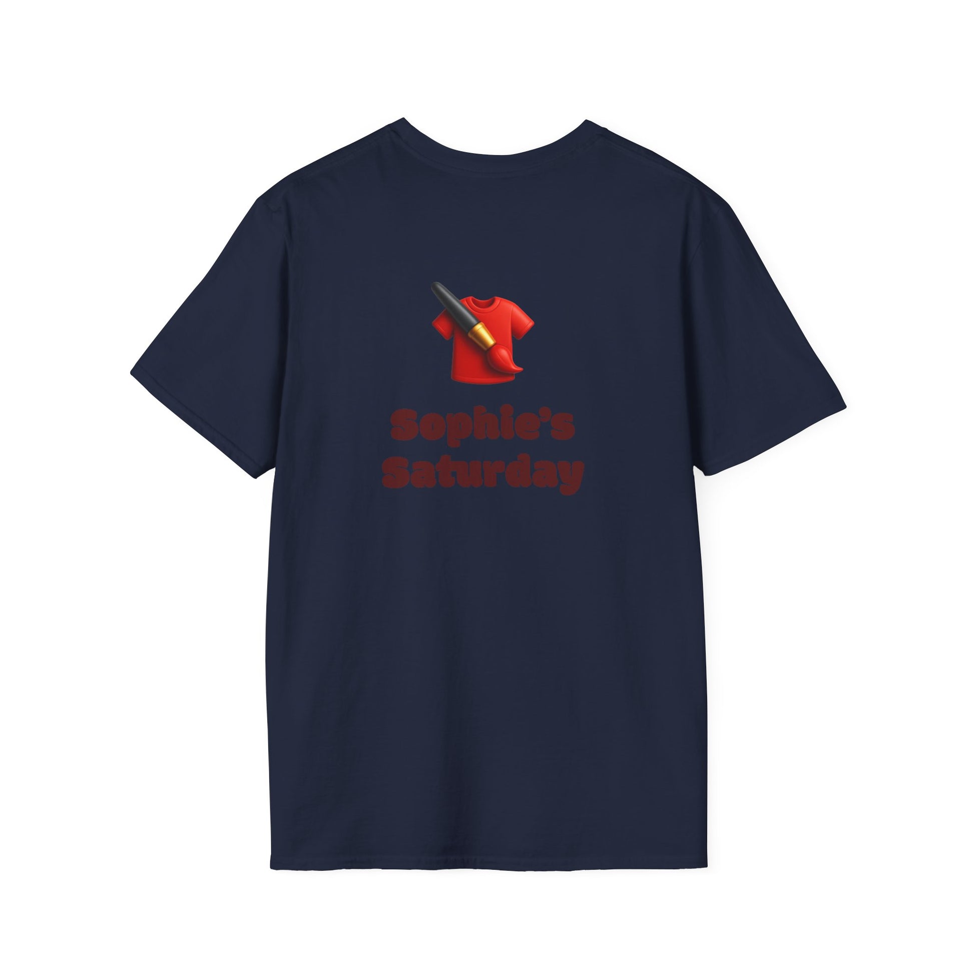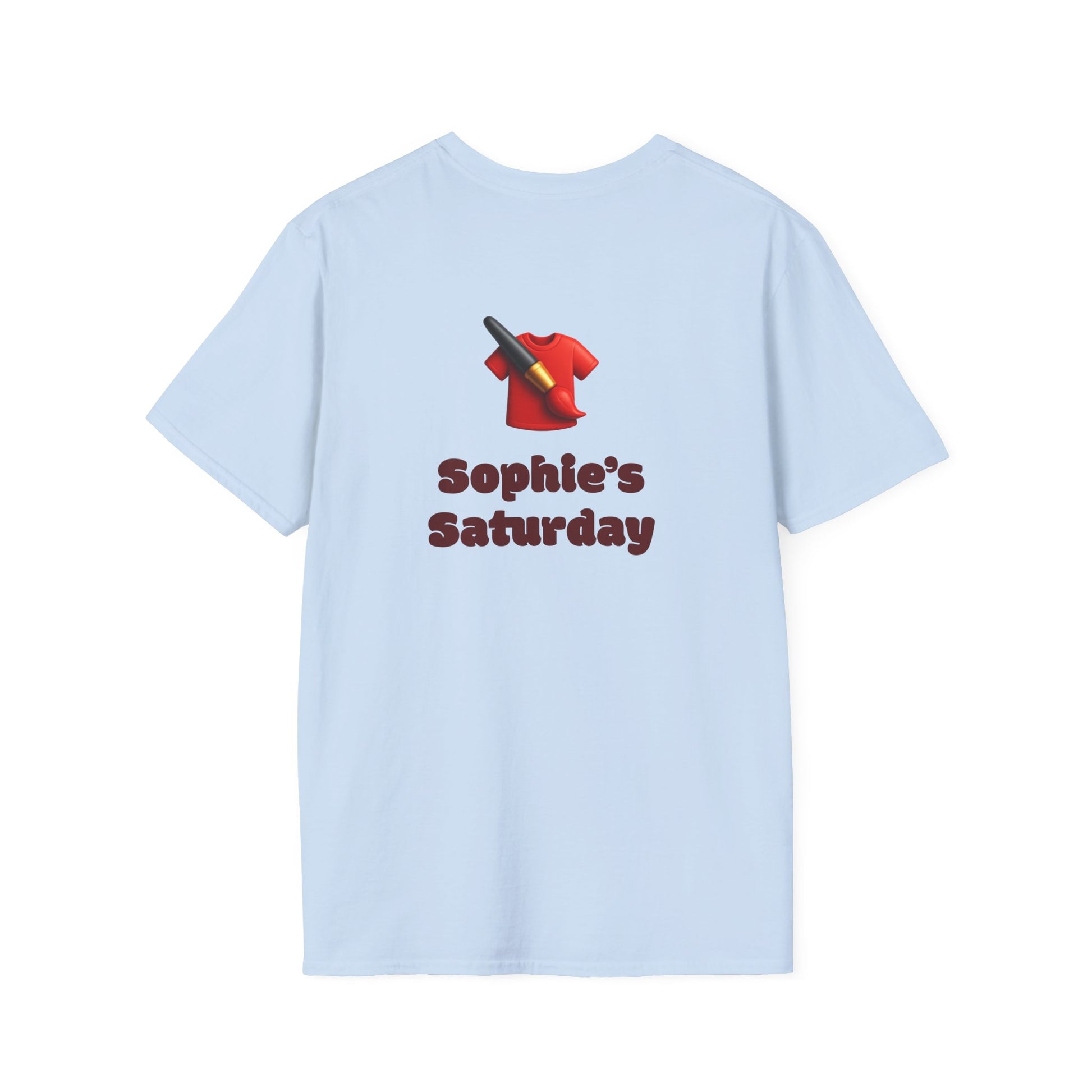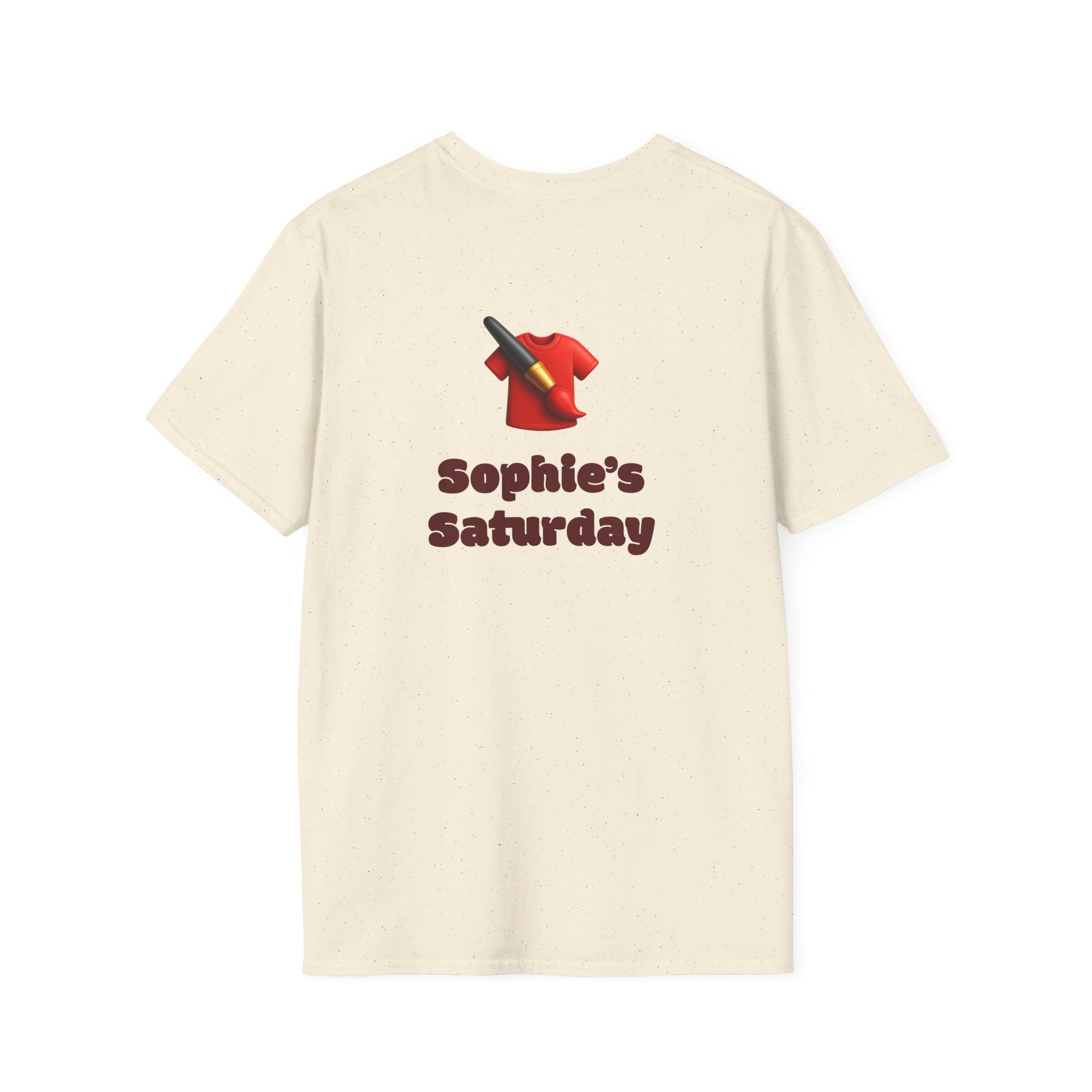 This lightweight cotton tee carries a bold, painterly print across the chest and a playful, personalized back design — a bright red floral square up front and a small icon with the text “Sophie’s Saturday” on the back. The shirt feels soft and breathable against the skin, draping easily for everyday wear. Wear it on slow weekend mornings with coffee in hand, to markets and small shows, or layered under a denim jacket for long city walks. The art-forward front gives an expressive, slightly vintage vibe while the back adds a warm, personal touch that reads like a shared inside moment. It’s an approachable piece for someone who likes color, handmade aesthetics, and items that tell a little story when they move through a room.