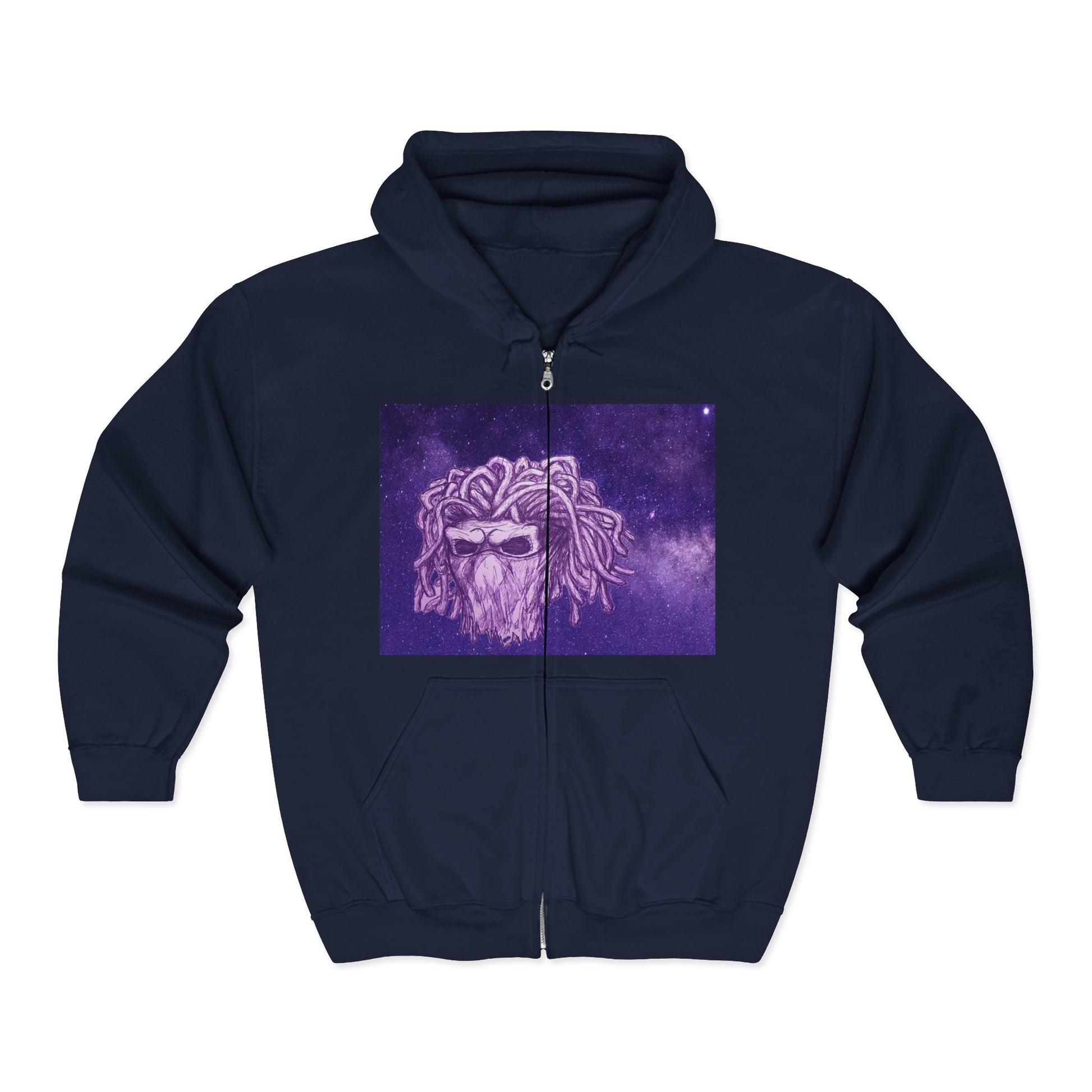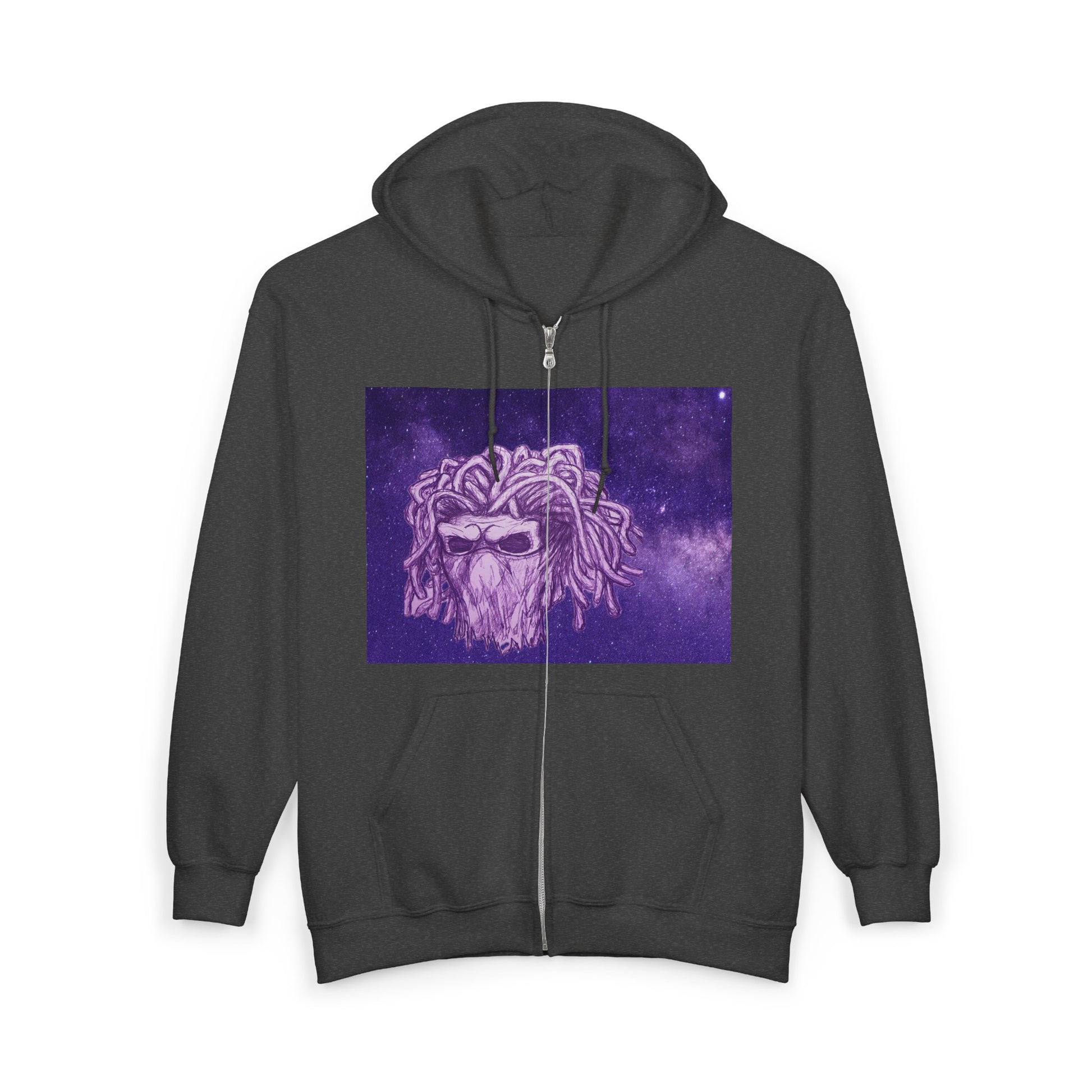 A cosmic-themed Hoodie with a purple starred background featuring a young masked male skull demon. This Hoodie gives off a cool and mysterious vibe, perfect for those who love unique and edgy fashion. Ideal for young adults looking to make a statement in their wardrobe. Relevatn for Halloween, Comic-Con, and music festivals.
