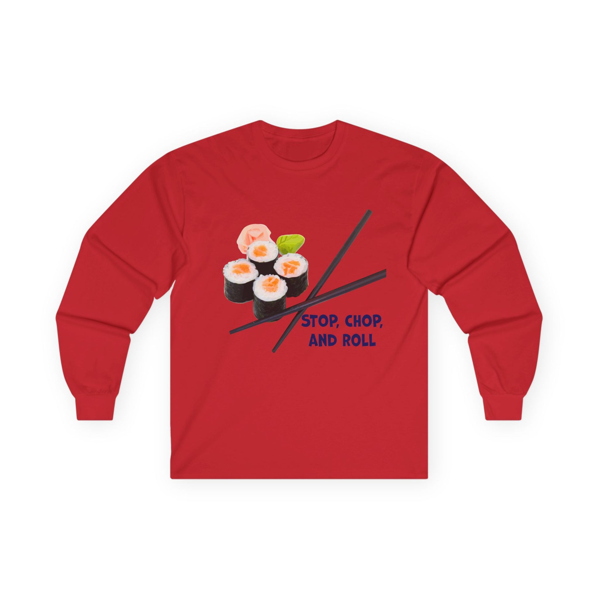 Sushi-Themed Long Sleeve Tee for Food Lovers, Perfect Gift for Foodies, Culinary Enthusiasts, Fun Casual Wear, Stop Chop and Roll Shirt